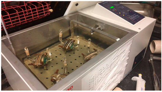 The test piece(s) with outer surface(s) facing the challenge chamber were then mounted between the PTFE gaskets, sealed by the flanges, and the nuts tightened. For gloving simulations, two pieces were used instead of one for double gloving, and three for triple gloving. The four assembled cells that were immersed except for the top halves of their stems in the water bath (Figure 1) were maintained at a shaking speed of 8.52 ± 0.05 cm/s to eliminate concentration gradients in the collection solvent. At the start of the 30 min equilibration period at 35 °C, 10.0 mL of triple de-ionized water was added to the four collection sides and any leaking noted. The test chemical (10.0 mL) was added at permeation time zero to the three challenge cells and the fourth cell acted as the air method blank. The mixing was restarted. Collection side sampling occurred at 0.0, 5, 10, 20, 30, 40, 50, 60, 120 and 135 min. The samples were taken with a 100 µL Eppendorf pipet with long tips (moving tray stopped), placed into pre-chilled 1 mL Pyrex vials and then stored at −20 °C. The glove samples were reconditioned at the original humidity conditions before the remeasuring of all the initial parameters.