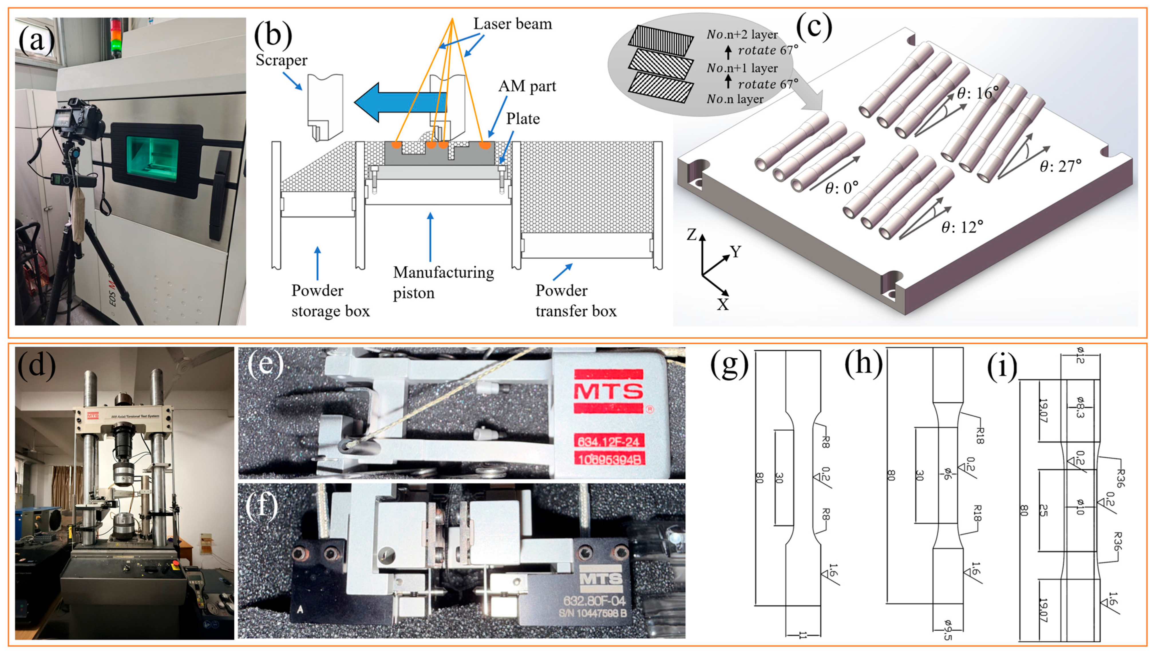 Considering that the loading cases applied in this paper are almost based on λ of 0.865 and 1.73, the final selected building directions were 0°, 12°, 16° and 27°. The 0° direction was included as a baseline reference, commonly used in prior studies, to assess the effect of small-angle deviations aligned with critical planes on multiaxial fatigue behavior. After fabrication, the specimens were separated from the direct base via wire-cutting, with heat-treated (2 h at 800 °C in argon atmosphere) and then machined by lathe processing to remove 0.5 mm thick inner and outer surfaces, respectively. The purpose of heat-treated was for stress relief annealing. The final specimen dimensions shown in