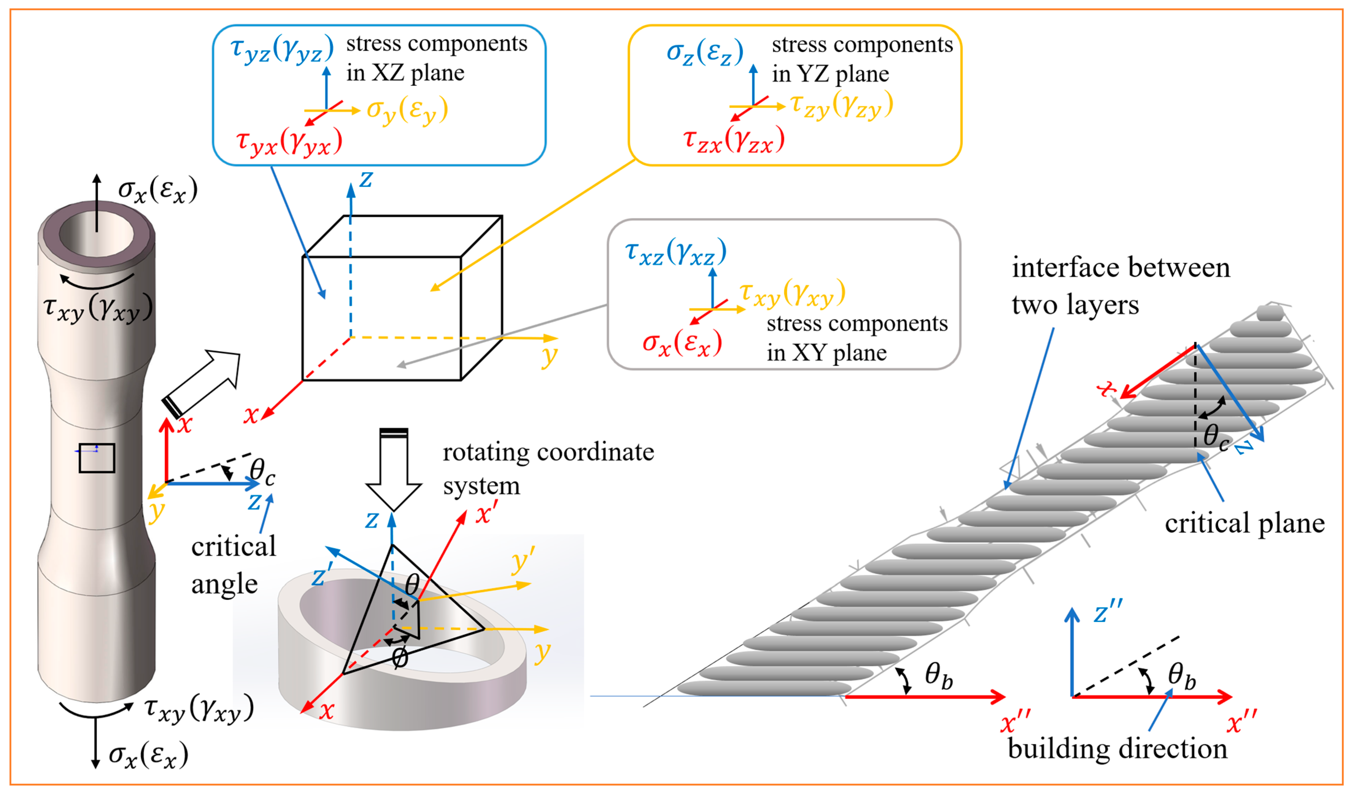 28]. Under multiaxial loading conditions, fatigue cracks typically initiate and propagate along a specific angular plane, commonly referred to as the critical plane. In strain-controlled loading modes, the critical plane is typically defined as the plane of either maximum principal strain or maximum shear strain. In this study, the selected building directions are oriented at approximately 90° to the respective critical planes, as shown in