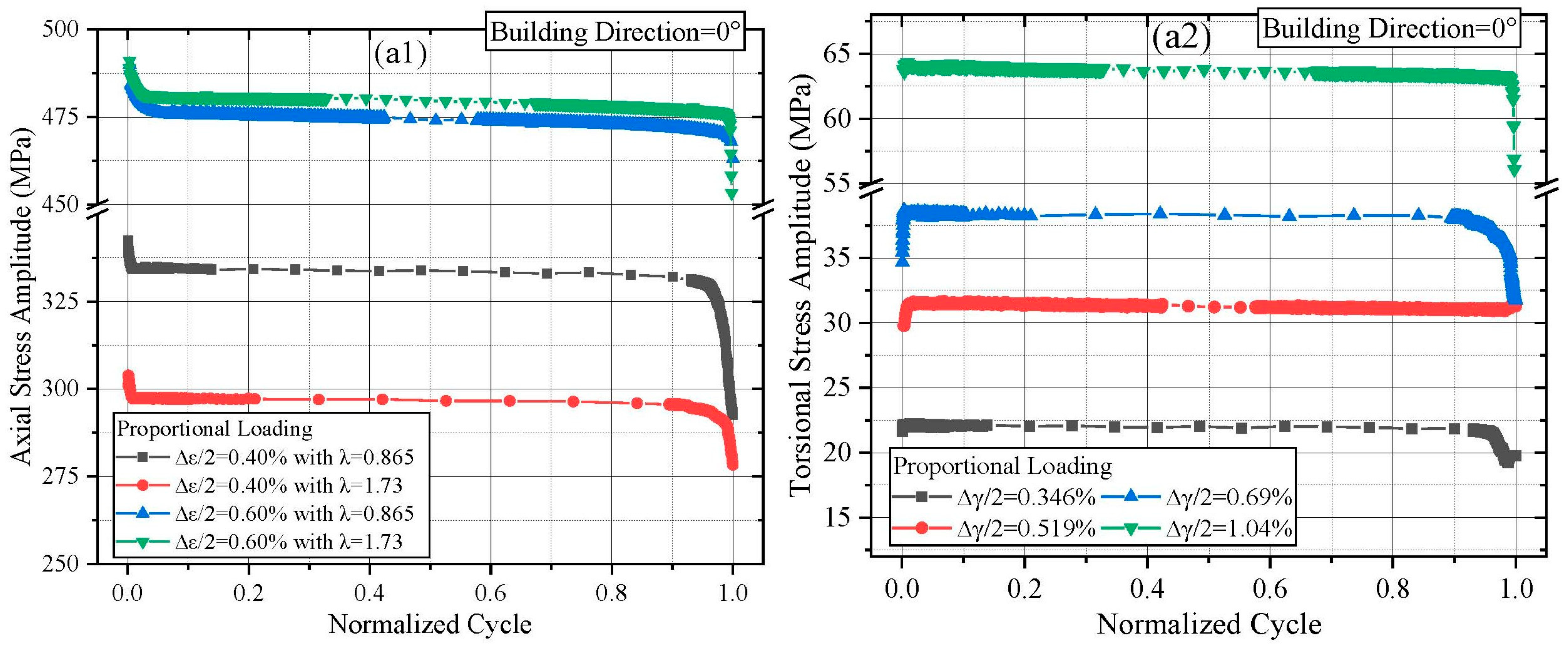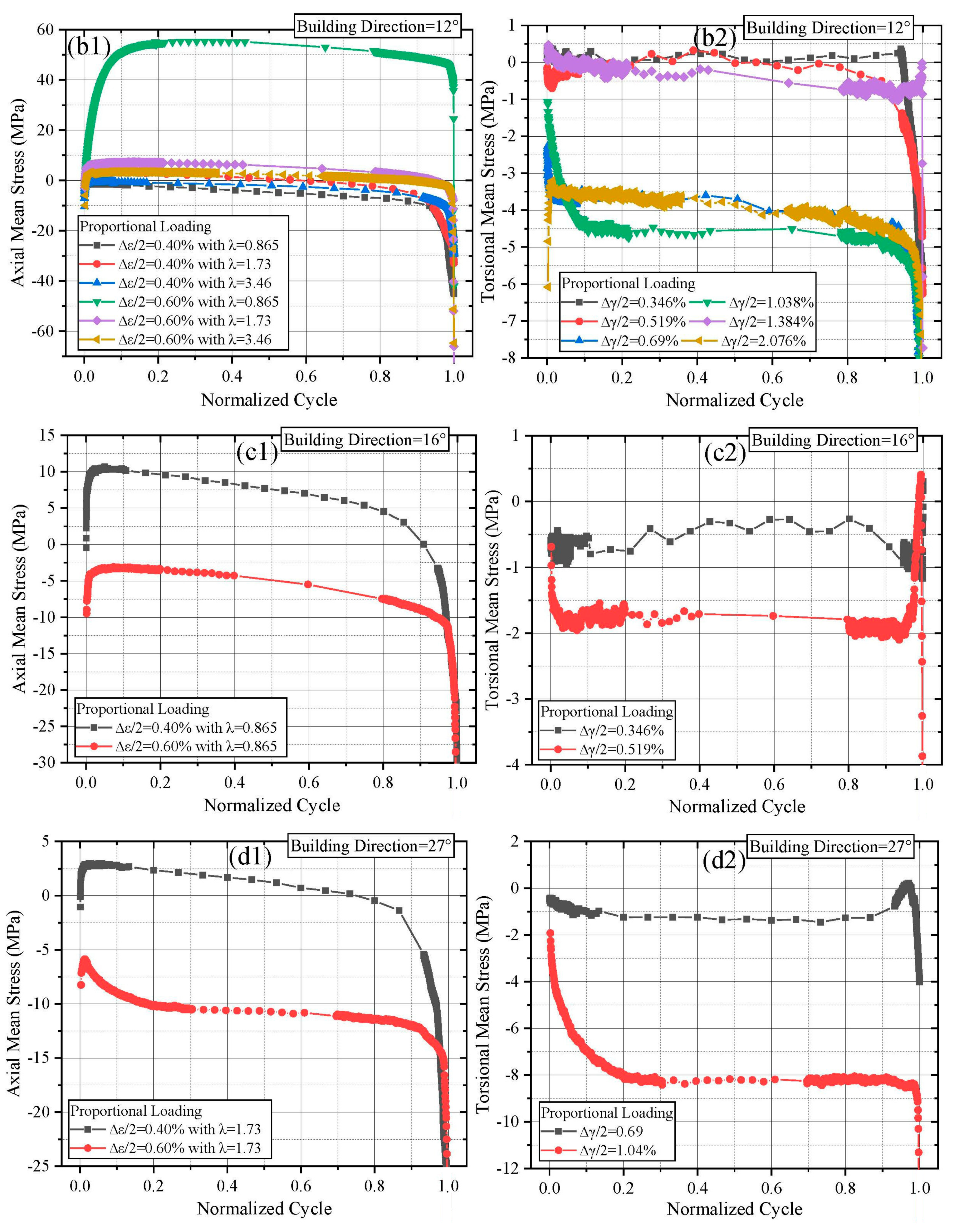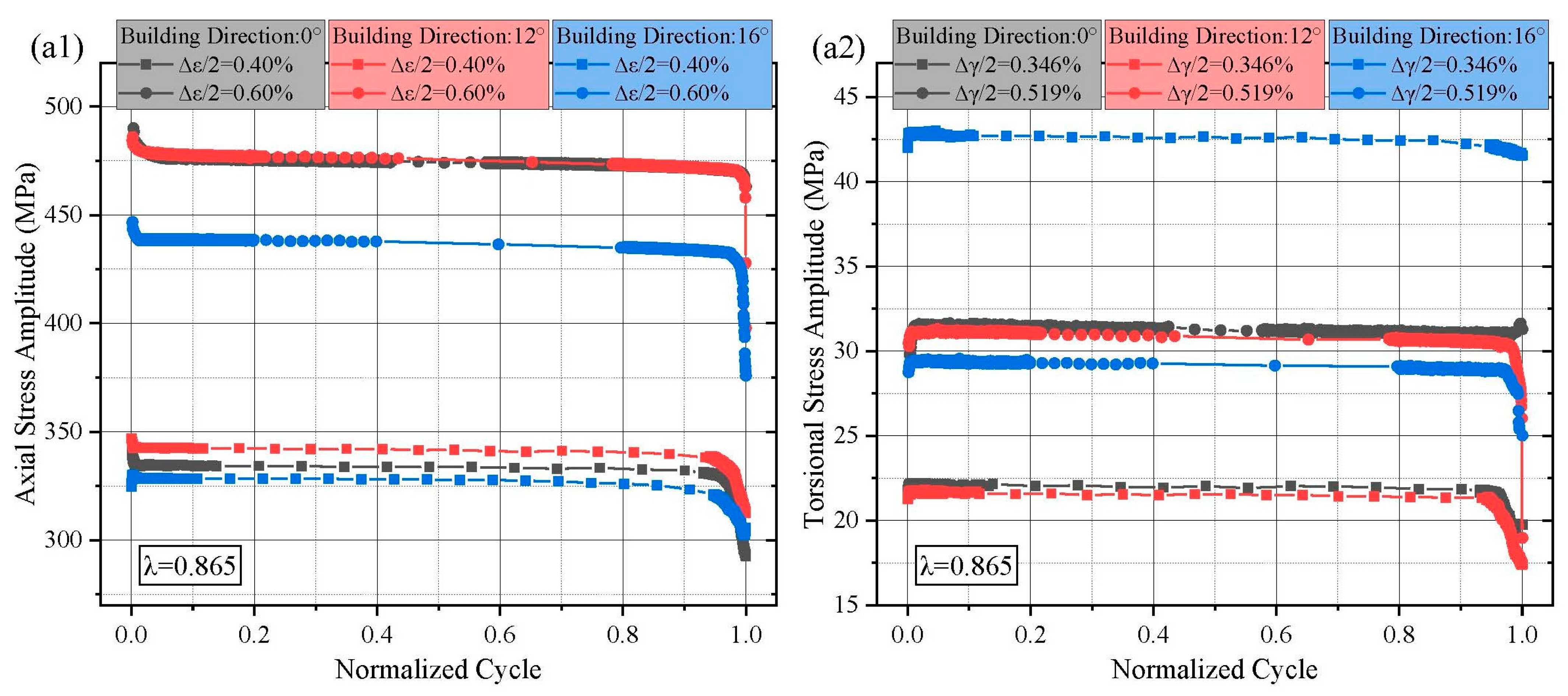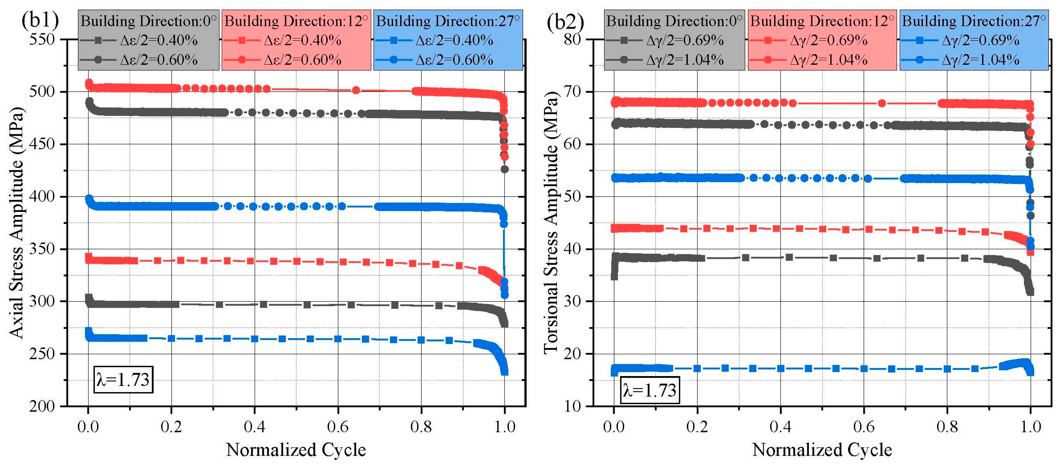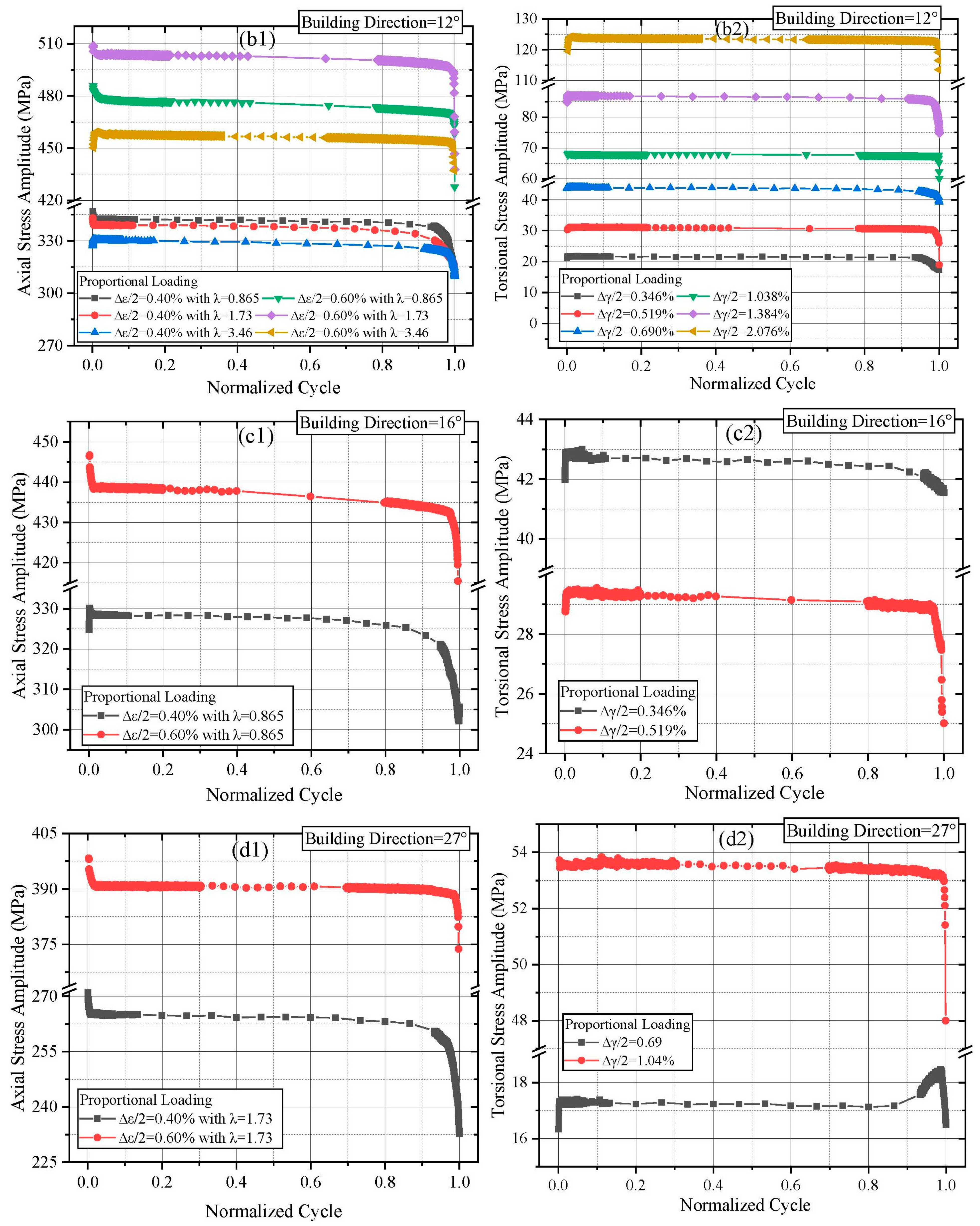 Figure 3(b1), specimens built at 12° and tested under λ = 0.865 and 1.73 similarly exhibited three-stage softening. An initial transient hardening was observed when the strain ratio increased to λ = 3.46. Compared to the 0° orientation, the 12° orientation showed slower stress amplitude decay under 0.4% axial strain with increasing λ. For 0.6% axial strain, the stress response showed a brief hardening phase before transitioning to softening as λ increased. It is worth mentioning that the unexpected peaks can be observed prior to failure occurred in the torsional stress responses, as shown in