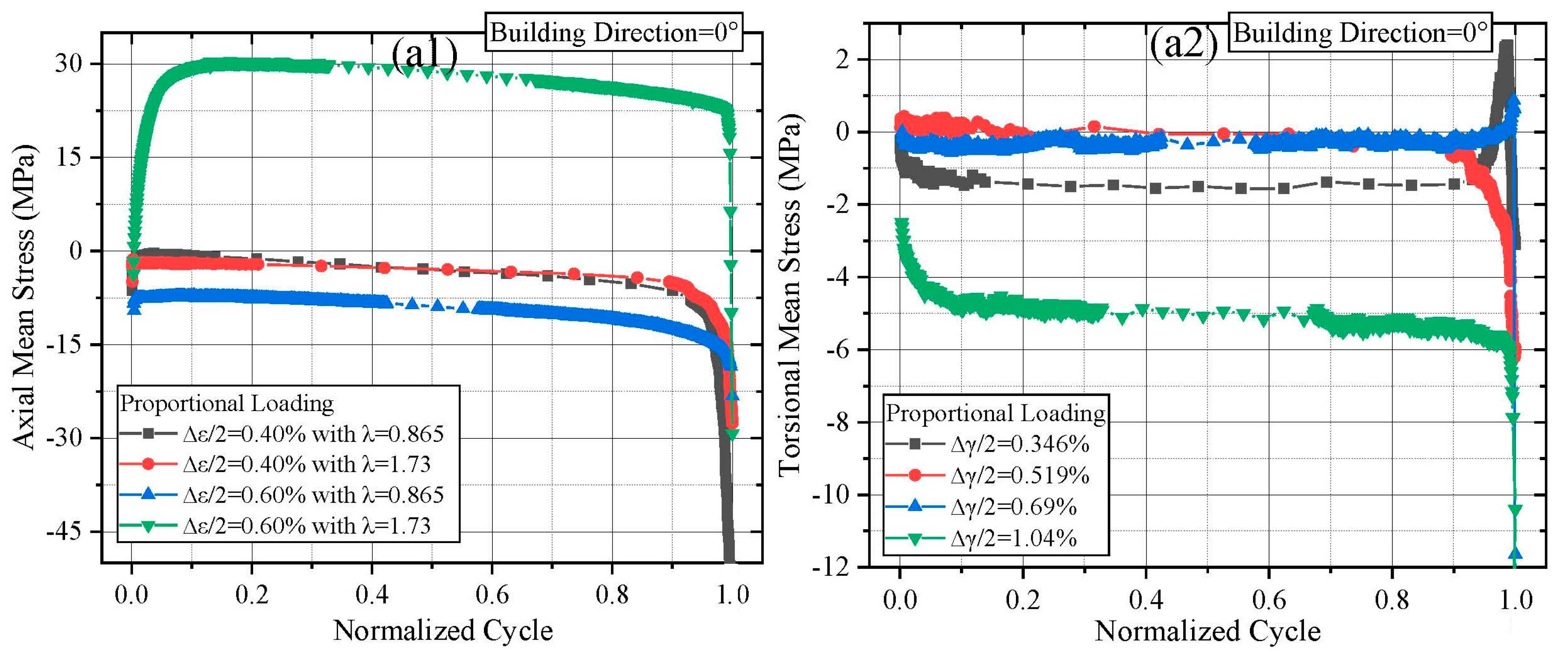 Figure 6(a1,a2), only specimen AMPMF04 (0° building direction) exhibited a pronounced increase in axial mean stress. The mean stress rose rapidly during the initial cycles, stabilized, and then remained relatively constant until final failure. A similar trend was observed in specimen AMPMF08 (12° building direction). Considering the magnitude of the mean stress relative to the magnitude of the stress amplitude, none of the specimens built at 16° and 27° exhibited a significant axial mean stress response. Regarding torsional mean stress, specimens with noticeable mean stress development followed similar patterns as those observed in the axial channel—rapid initial accumulation followed by stabilization until failure.