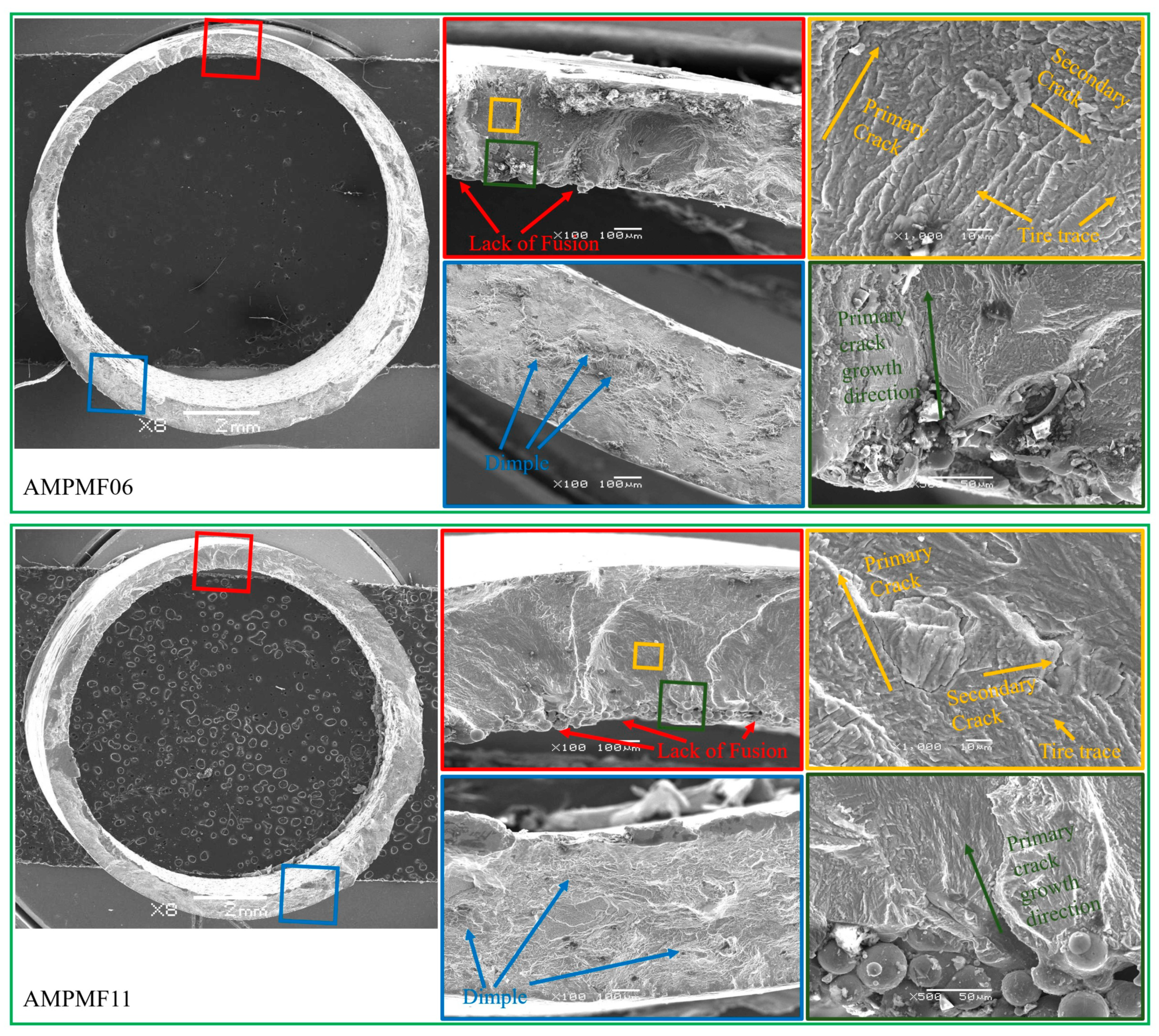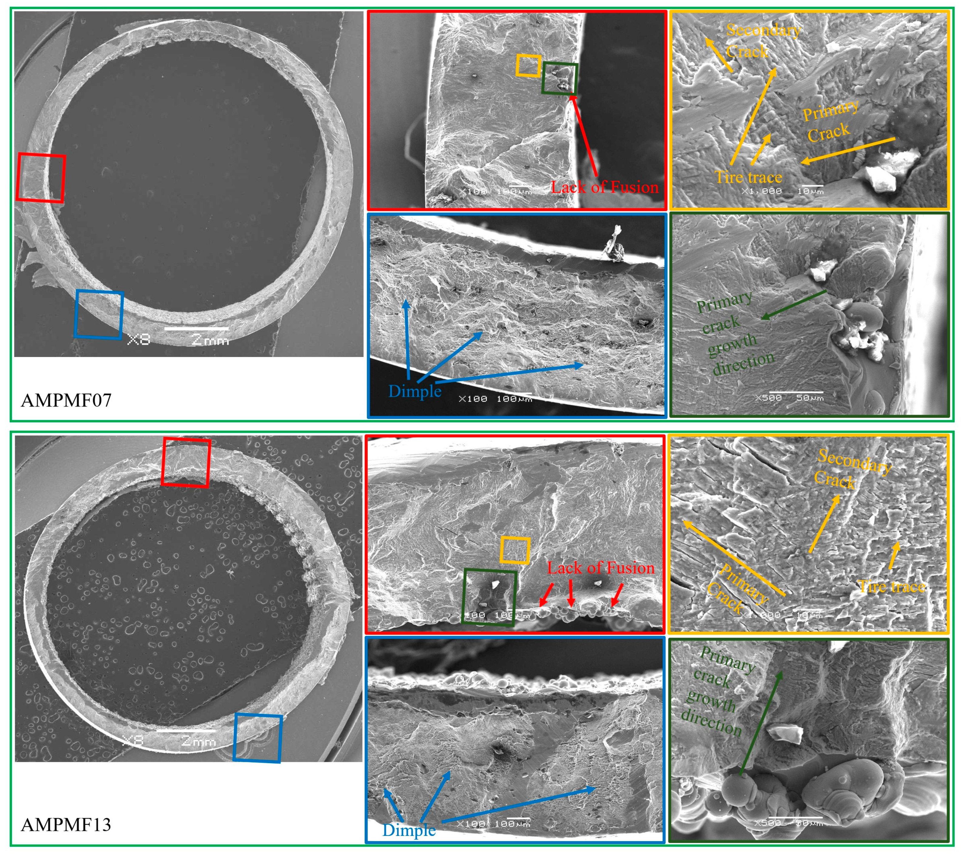 Specimen AMPMF11 (16° building direction) exhibits fracture morphology highly comparable to AMPMF05. The pronounced cleavage and quasi-cleavage characteristics are closer to the fracture mechanism of rolled titanium after failure under similar applied multiaxial loading. A large number of dimples in the final rupture zone confirms the ductile nature of the failure. In contrast, specimen AMPMF13 (27° building direction) shows fracture features more akin to those of AMPMF02. The fatigue striation and tire trace in the crack propagation zone became finer and less distinct, suggesting a change in crack growth dynamics. Furthermore, the final rupture zone contains fewer dimples and more featureless regions, suggesting a subtle transition toward brittle fracture behavior, although most plastic characteristics are retained.