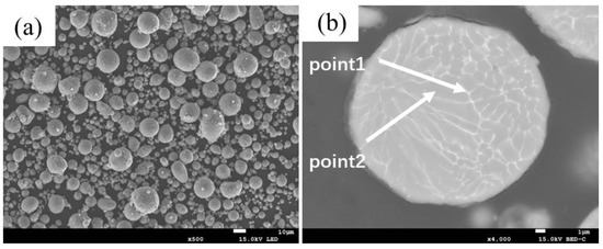 Backscattered Electron Images (BEI) of the 2024 Aluminum Alloy Particles: (a) Particles; (b) Cross-Section of a 2024 Aluminum Alloy Particle.