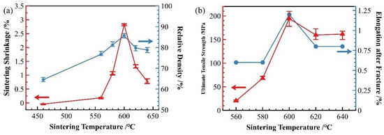 Figure 2 presents the sintering shrinkage rate, relative density, and ultimate tensile strength of SiCp/Al-1 composite samples sintered for 30 min at different temperatures. The shrinkage rate, relative density, strength, and elongation after fracture of the samples all initially increased and then decreased as the temperature increased.