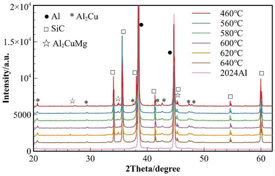 XRD patterns of SiCp/Al-1 samples held at different sintering temperatures for 30 min.