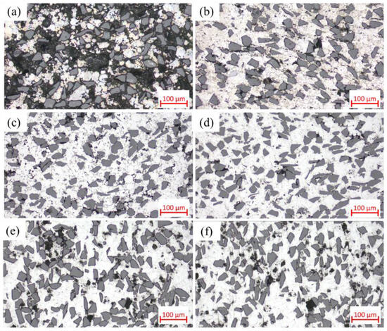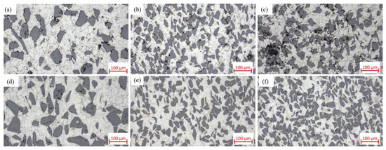 Optical micrographs of as-sintered SiCp/Al composites: (a) SiCp/Al-2; (b) SiCp/Al-3; (c) SiCp/Al-4; optical micrographs of hot-pressed SiCp/Al composites: (d) SiCp/Al-2; (e) SiCp/Al-3; (f) SiCp/Al-4.