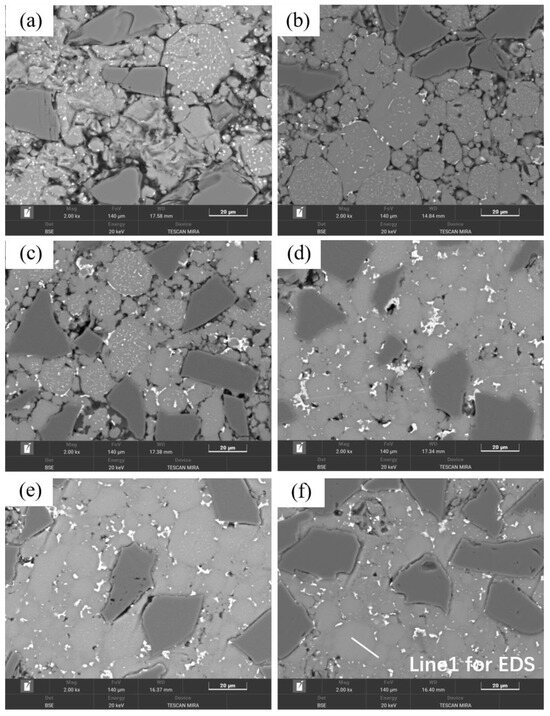 Backscattered electron images (BEI) of SiCp/Al-1 samples held at different sintering temperatures for 30 min: (a) 460 °C; (b) 560 °C; (c) 580 °C; (d) 600 °C; (e) 620 °C; (f) 640 °C.