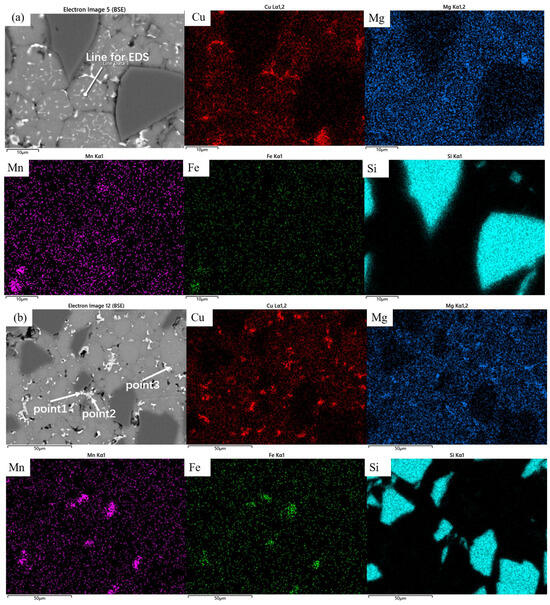 Backscattered electron image (BEI) of the SiCp/Al-1 sample after holding at (a) 560 °C and (b) 600 °C for 30 min, along with their corresponding EDS elemental maps showing the distribution of Cu, Mg, Mn, Fe, and Si.