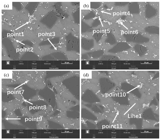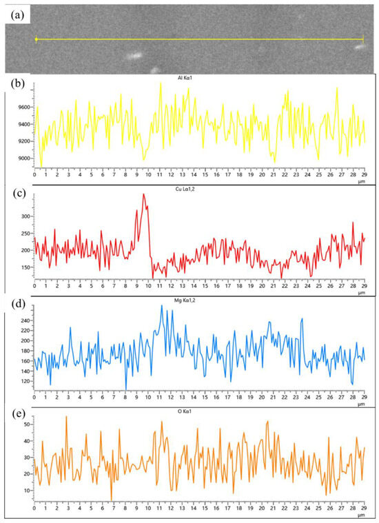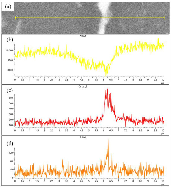 The samples sintered at 560 °C demonstrated significantly enhanced densification compared to those processed at 460 °C, with evident interparticle bonding formation. Compared to the coarse dot-like precipitates observed within the matrix particles at a sintering temperature of 460 °C, distinct needle-like and fine dot-like precipitates have now formed inside the particles, with the size of the dot-like phases significantly reduced. The previously plastically deformed matrix particles exhibited noticeable spheroidization transformation. However, distinct interfaces and voids remained observable, primarily categorized into two types: interfacial voids at ceramic particle/matrix boundaries and triangular voids formed between matrix particles. At the same time, the precipitation morphology underwent substantial transformation, exhibiting continuous precipitates along particle edges (Figure 7a). Elemental distribution analysis revealed more uniform dispersion of Cu and Mg compared to the low-temperature condition, with Cu predominantly enriched in the continuous intergranular precipitates. EDS line scanning confirmed these grain-boundary precipitates as Al-Cu compounds (Figure 8), while slightly elevated oxygen content was detected at particle surfaces. According to the Al-Cu binary phase diagram, these interfacial precipitates were identified as Al-Cu eutectic liquid phase. Additionally, Mn- and Fe-enriched precipitates were observed among particles alongside the Al-Cu eutectic phases.