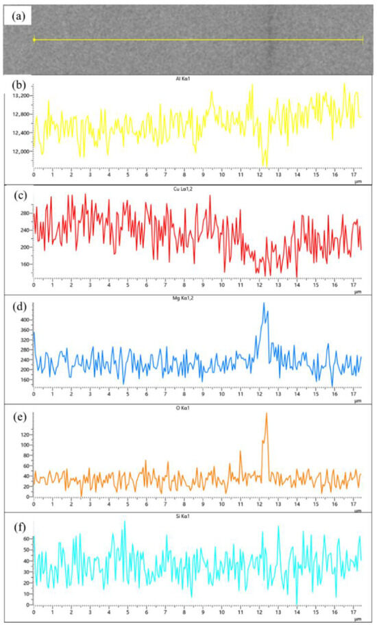 (a) Backscattered electron image (BEI) of the particle interface in SiCp/Al-1 after holding at 640 °C for 30 min; corresponding EDS spectra of (b) Al, (c) Cu, (d) Mg, (e) O, and (f) Si, respectively.