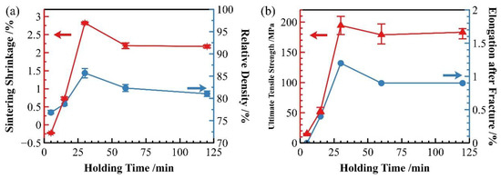 Figure 10b demonstrates that the strength of sintered samples exhibits a clear correlation with their densification degree. Both the strength and elongation of sintered samples follow trends similar to the shrinkage rate. When holding time was extended from 15 to 30 min, the material’s strength showed rapid improvement, peaking at 30 min. Further extension of holding time resulted in a slight decrease in strength, though it remained substantially higher than values obtained at 5 and 15 min holding times.