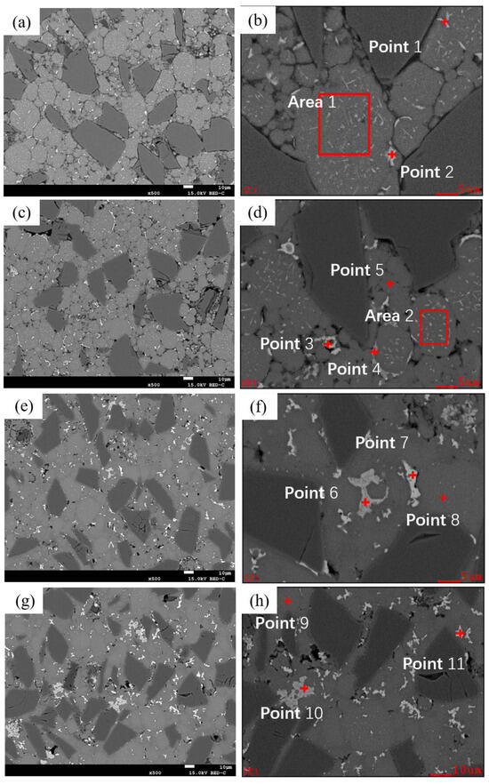 Backscattered Electron Images (BEI) of as-sintered SiCp/Al-1 samples at different holding times under a sintering temperature of 600 °C: (a,b) 5 min; (c,d) 15 min; (e,f) 60 min; (g,h) 120 min.