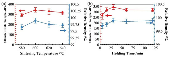 From the perspective of relative density and strength variations after hot pressing, the hot-pressing process significantly enhances both the densification and mechanical properties of as-sintered aluminum matrix composites, serving as an effective method to improve overall material performance. Figure 15 presents the relative density and strength data of samples subjected to different sintering temperatures (with a 30 min holding time) and varying holding times at 600 °C after hot pressing. The results show that the trends remain largely consistent with those of the as-sintered state, with all hot-pressed samples exhibiting improved density and strength across different processing conditions.