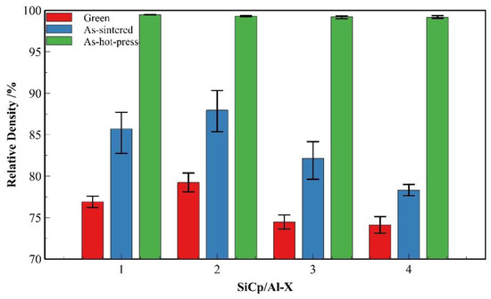 Figure 16 presents a comparative analysis of the relative densities of four SiCp/Al composites (SiCp/Al-1 to SiCp/Al-4) in three processing states: as-compacted, as-sintered, and hot-pressed. The comparison between SiCp/Al-1, SiCp/Al-3 and SiCp/Al-4 demonstrates that increasing SiC particle content leads to reduced densities in both as-compacted and as-sintered states. This phenomenon can be attributed to two primary factors: (1) higher SiC content increases the difficulty of particle plastic deformation and mechanical interlocking during powder compaction, thereby reducing powder compressibility; (2) the decreased aluminum matrix volume results in less liquid phase formation during sintering, which adversely affects particle rearrangement and subsequent densification. In contrast, the comparison between SiCp/Al-1 and SiCp/Al-2 reveals that coarser ceramic particles contribute to higher densities in both as-compacted and as-sintered states. At identical SiC mass fractions, larger particle sizes correspond to fewer SiC particles and improved powder flowability, enhancing compactibility during forming. Additionally, the reduced interfacial area between SiC particles and aluminum matrix facilitates better wetting during sintering. In the hot-pressed state, all four composites achieve near-full density. The hot-pressing process effectively compensates for the densification limitations encountered during earlier processing stages, demonstrating its crucial role in achieving optimal composite density.