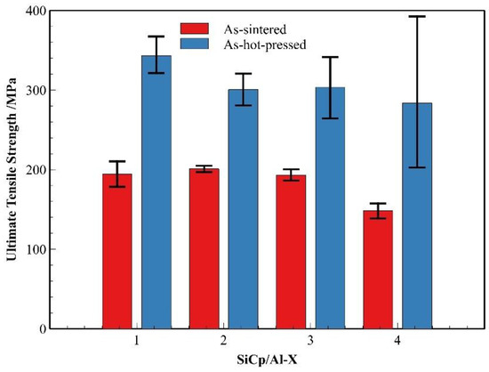 Building upon the influence of reinforcement characteristics on composite densification, we further investigated the mechanical properties of the composites in both sintered and hot-pressed conditions. As shown in Figure 18, comparative analysis of SiCp/Al-1, SiCp/Al-3, and SiCp/Al-4 reveals that when the SiC content increases to 45%, the sintered composites exhibit a significant reduction in average strength. More notably, the hot-pressed composites demonstrate even more pronounced strength variations—while the average hot-pressed strength progressively decreases with rising ceramic content, the strength data simultaneously shows increasingly wider fluctuation ranges. The increased ceramic content substantially elevates the challenges for densification for composites in both processing states. Particularly in hot-pressed condition, where the achieved density directly governs material strength, a higher SiC content renders the composites more sensitive to the processing parameter variations. Fluctuation either in temperature or pressure during hot-pressing results in changes in the mechanical strength data, explaining the observed broadening of strength variations at elevated reinforcement levels. Furthermore, it can be observed that at the same ceramic content, the aluminum matrix composites prepared with finer SiC particles achieve higher tensile strength in the dense state.