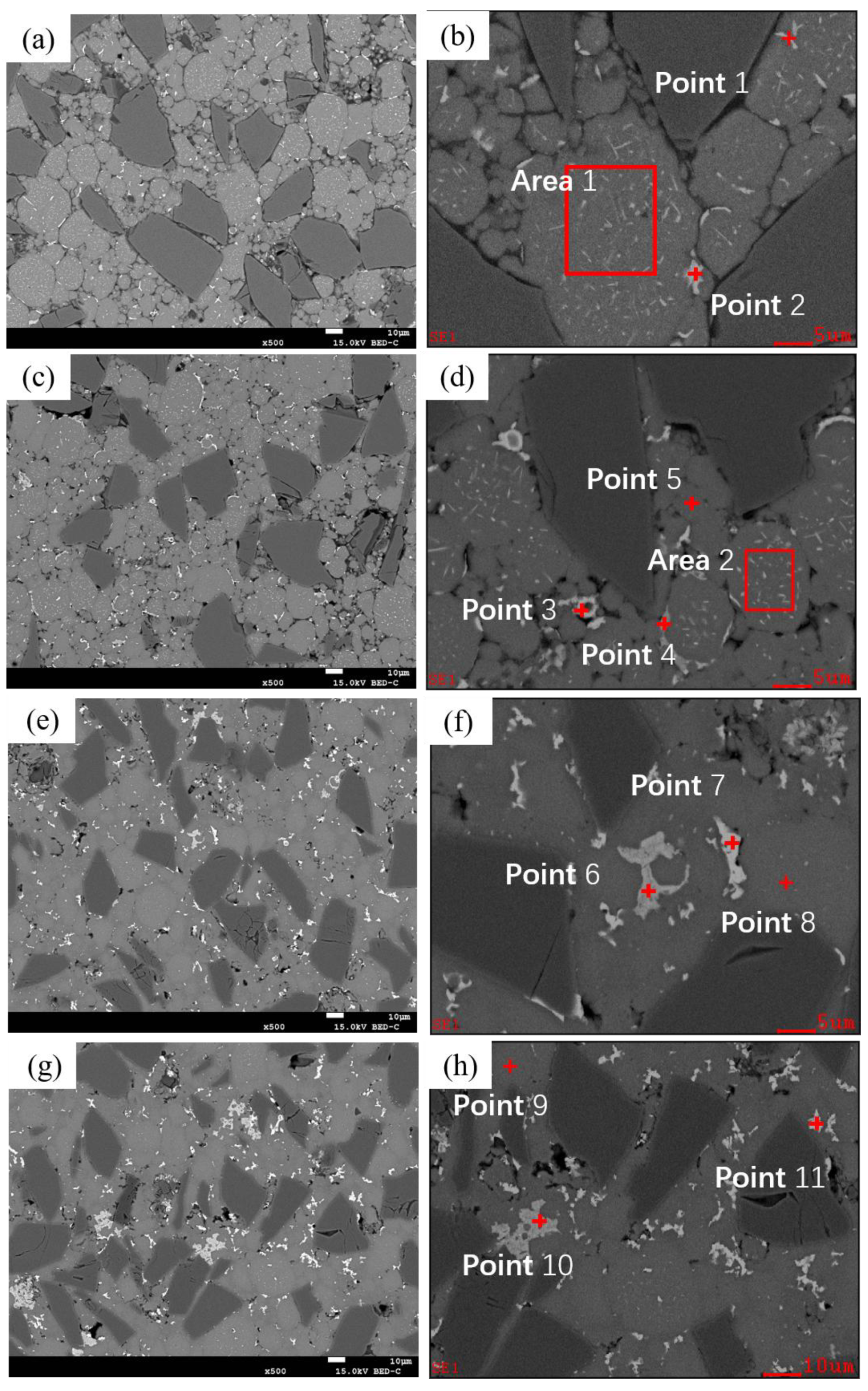 Figure 5, in addition to the degree of densification, the precipitates in the material’s microstructure evolved significantly with sintering temperature. As the temperature increased, the precipitation sites progressively transitioned from the particle interiors to the grain boundaries. For the samples sintered at 460 °C, distinct dot-like precipitates were observed within or on the surface of most matrix particles. EDS analysis (