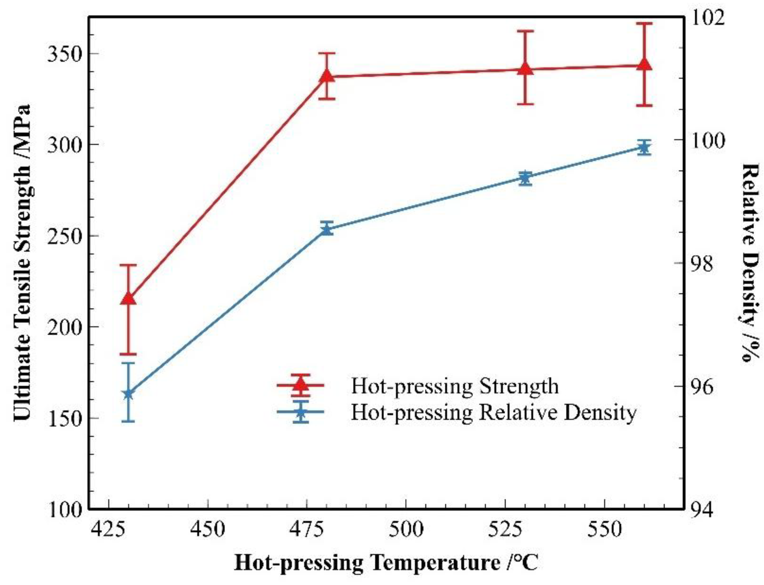 Figure 12 presents the strength and relative density data of the material after hot pressing at different temperatures. As shown in the figure, both the strength and relative density of the material significantly improved after hot pressing. The most notable enhancement in material strength and densification occurred as the hot-pressing temperature increased from 430 °C to 480 °C. With further increases in temperature, the change in relative density became more pronounced compared to the change in strength.