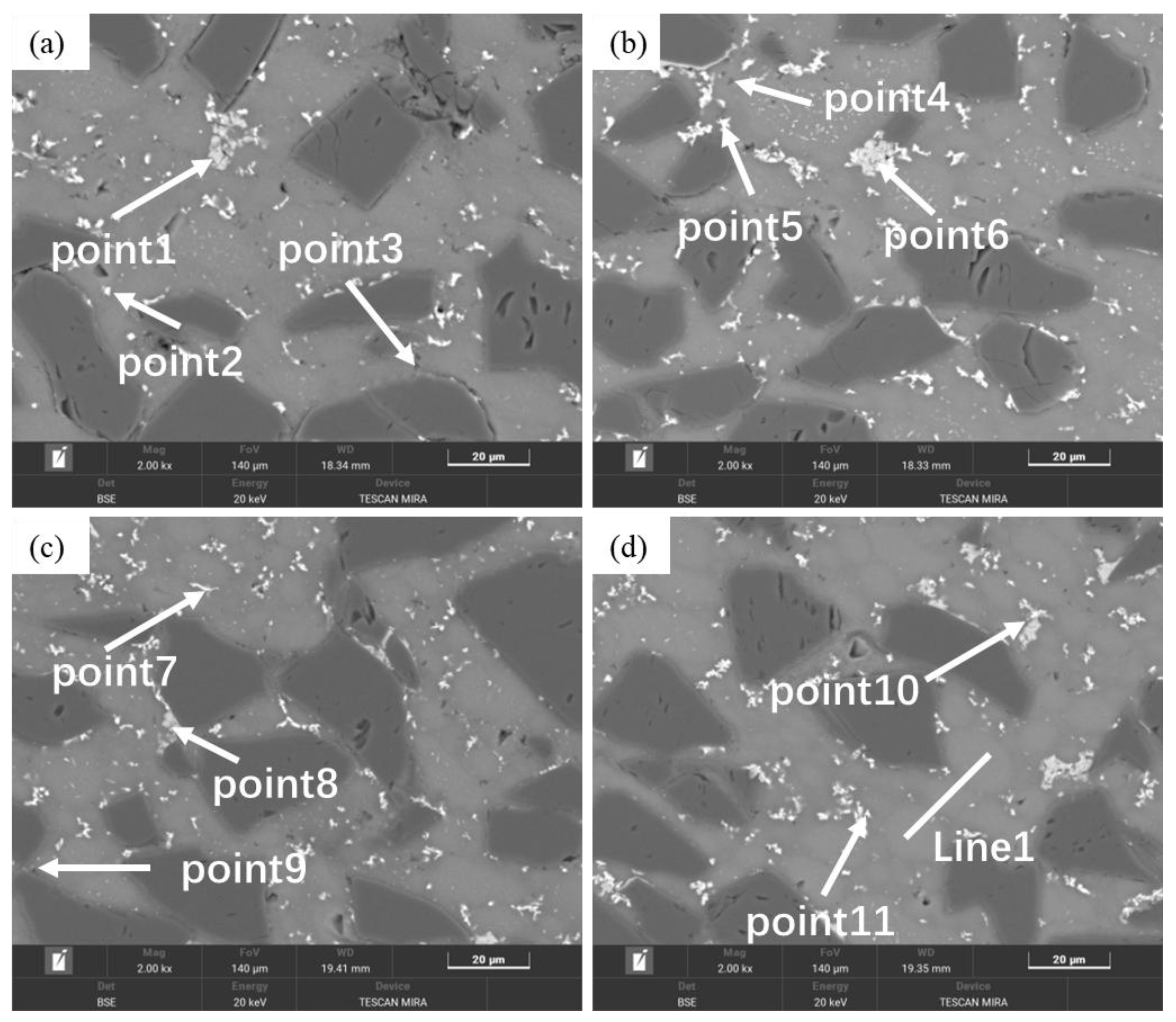 28]. Compared to low-temperature sintered samples, the Mn- and Fe-containing precipitates increased substantially. The elevated temperature promoted greater liquid phase formation, while reduced surface tension enhanced the wettability of the liquid phase on matrix particle surfaces, thereby improving void-filling effectiveness.