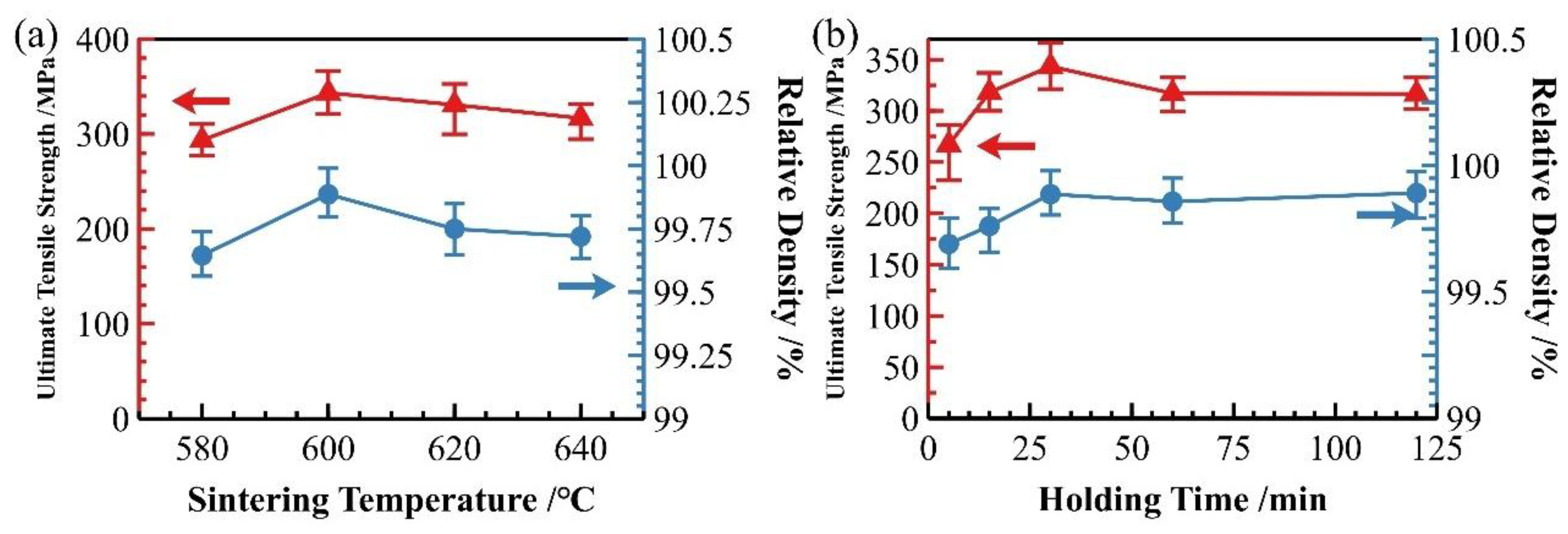 Figure 15 presents the relative density and strength data of samples subjected to different sintering temperatures (with a 30 min holding time) and varying holding times at 600 °C after hot pressing. The results show that the trends remain largely consistent with those of the as-sintered state, with all hot-pressed samples exhibiting improved density and strength across different processing conditions.