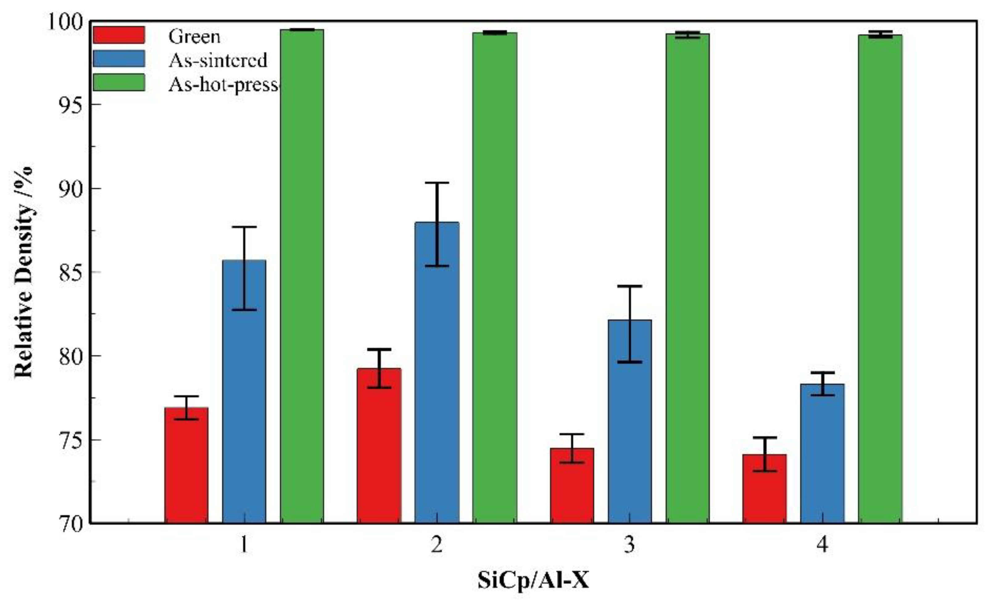 p/Al-2 reveals that coarser ceramic particles contribute to higher densities in both as-compacted and as-sintered states. At identical SiC mass fractions, larger particle sizes correspond to fewer SiC particles and improved powder flowability, enhancing compactibility during forming. Additionally, the reduced interfacial area between SiC particles and aluminum matrix facilitates better wetting during sintering. In the hot-pressed state, all four composites achieve near-full density. The hot-pressing process effectively compensates for the densification limitations encountered during earlier processing stages, demonstrating its crucial role in achieving optimal composite density.