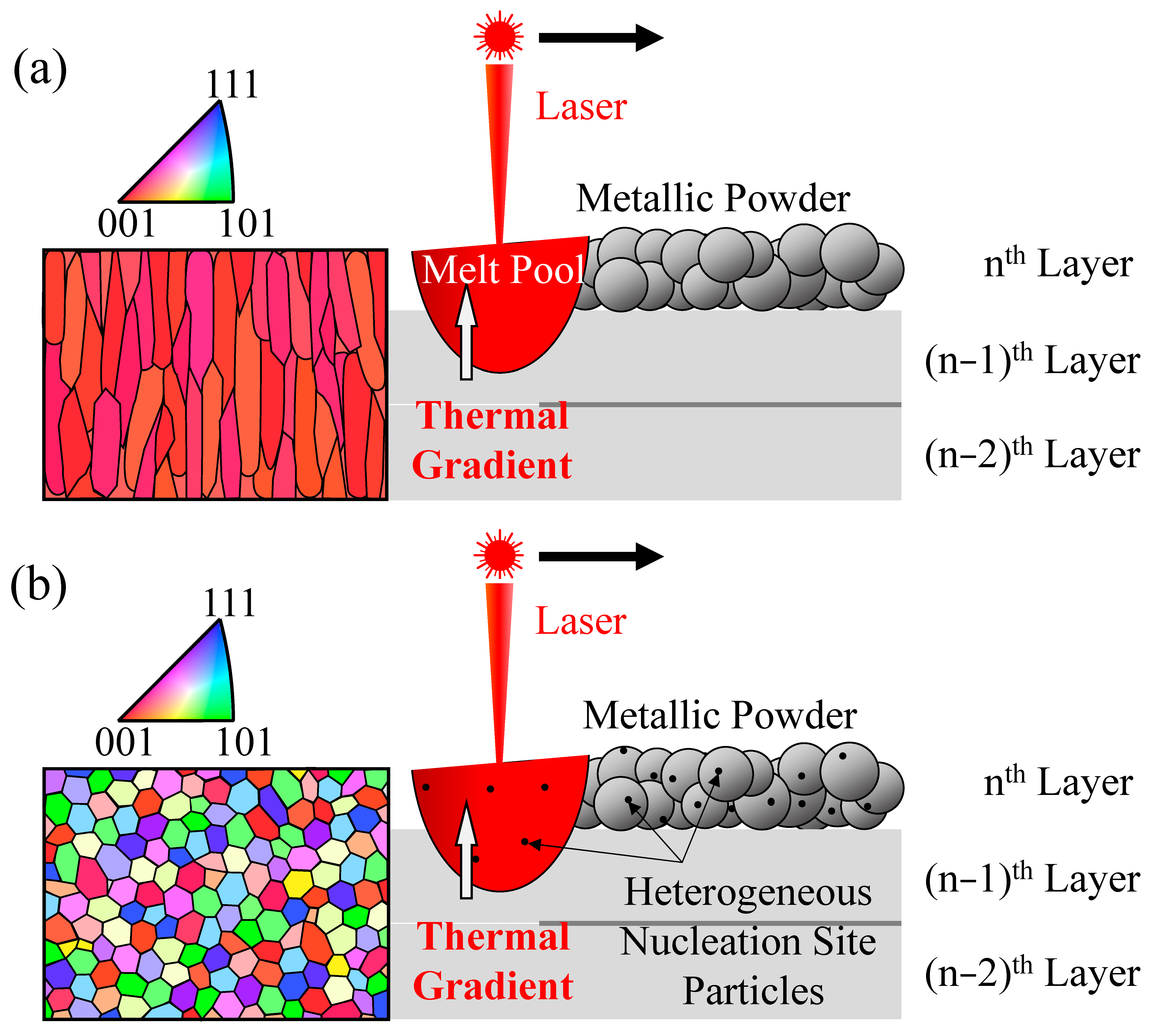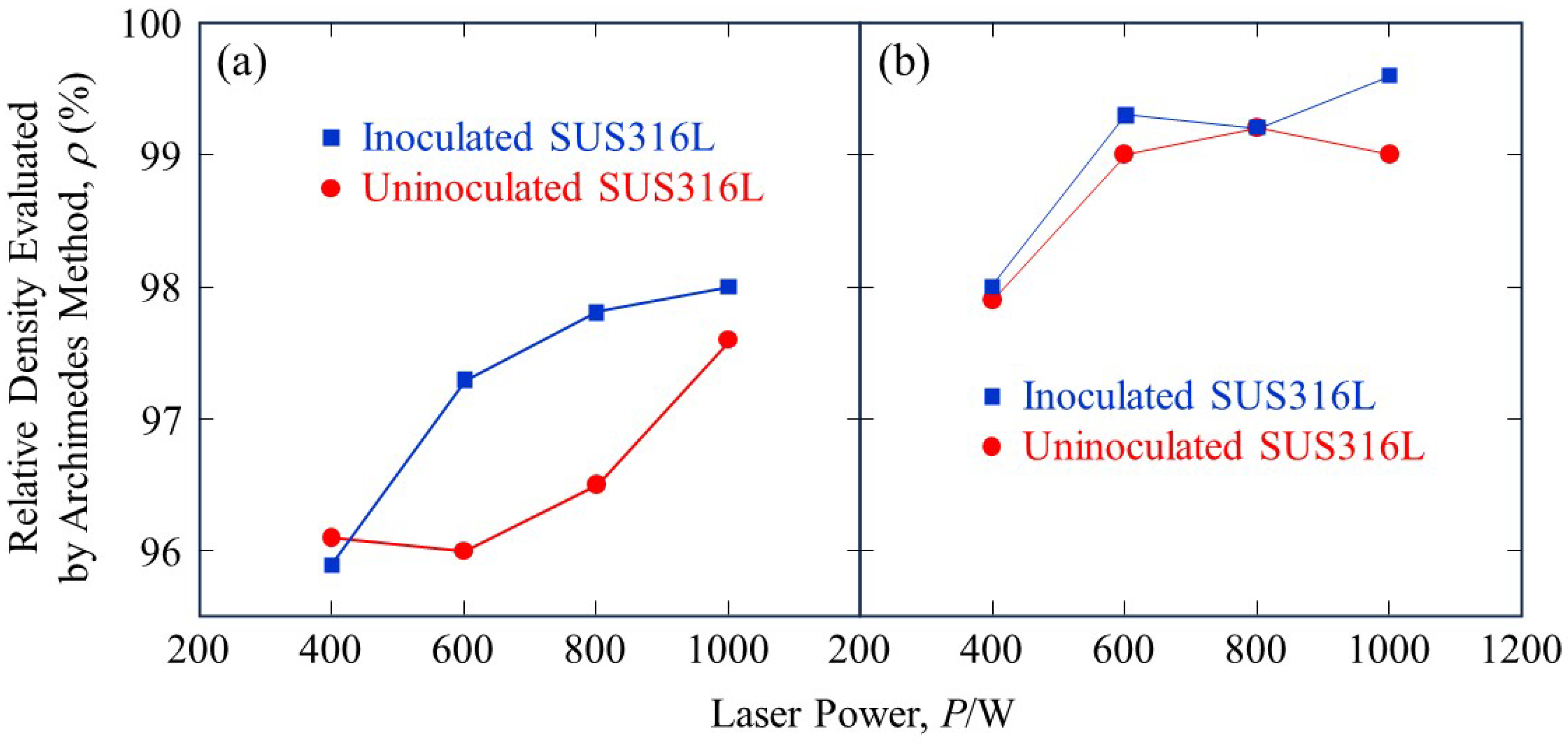 - When using the ALPION Series machine, unidirectional and cross-scanning strategies were employed. The inoculated samples with SrO particles demonstrated fewer defects and had refined, equiaxed grain structures compared to those of the uninoculated samples. This indicates that SrO particles effectively reduce defects and refine microstructure in the powder-based DED method.