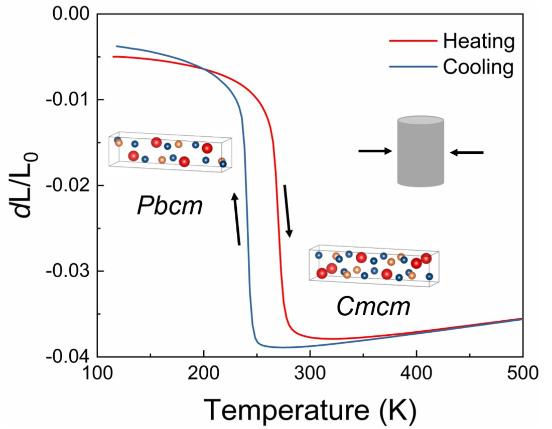 In order to gain deeper mechanistic insight into the in-plane contraction induced by the phase transition, the temperature dependence of phase fractions and the lattice parameters for both the Cmcm and Pbcm phases were extracted. As shown in Figure 3a, the fraction of the low-temperature Pbcm phase reaches as high as 75% at 123K and decreases monotonically with increasing temperature; meanwhile, the fraction of the high-temperature Cmcm phase increases. The Pbcm phase fraction reaches 0% at 273 K, indicating complete transformation to the Cmcm phase. Given that both the Pbcm and Cmcm phases exhibit tetragonal symmetry, the temperature dependences of the lattice parameters were compared to identify the axis driving the in-plane contraction (Figure 3b–d). From 223 K to 273 K, the a-axis undergoes a significant contraction up to 4.5%, whereas the b-axis and c-axis expand by 4% and 0.5%, respectively. The prominent anisotropy demonstrates that the in-plane contraction is primarily driven by the a-axis. For typical polycrystalline compounds, thermal expansion behavior reflects the average response of all lattice axes. However, the arc-melted TbCoSi2 intermetallic compound exhibits significant crystallographic preferred orientation, which originates from the rapid cooling during solidification [3,4]. Consequently, the a-axis of TbCoSi2 is predominantly aligned along the plane direction of the ingot, which gives rise to the observed significant in-plane contraction.
