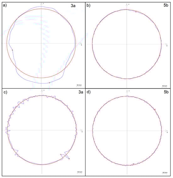 Roundness and waviness profile: (a) roundness profile of sealing ring of bearing no. 3a, (b) roundness profile of sealing ring of bearing no. 5b, (c) waviness profile of sealing ring of bearing no. 3a, (d) waviness profile of sealing ring of bearing no. 5b.