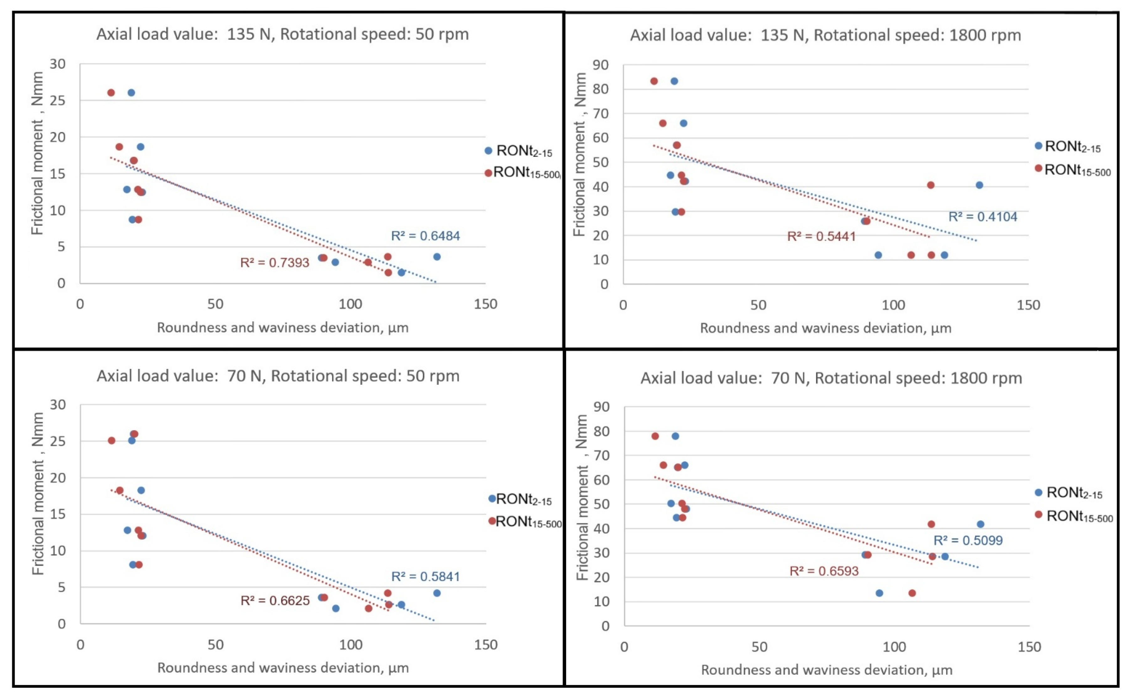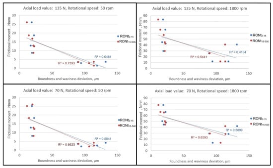 To ensure more comprehensive interpretation of the measurement data, a correlation analysis was conducted between the frictional moment (all 10 bearings). Coefficients of determination (R2) were calculated to quantify the strength of these relationships. The results were visualized using scatter plots, incorporating two key variables for frictional moment measurements: rotational speed (50 rpm and 1800 rpm) and axial load (70 N and 135 N).