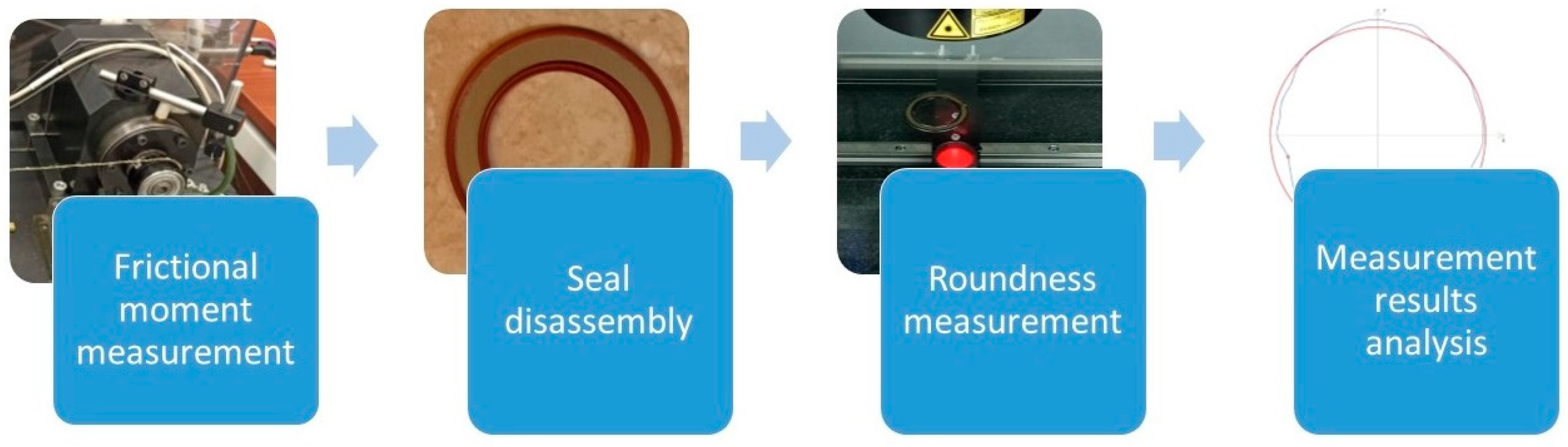 The research presented in this article was divided into two main stages. In the first stage, the frictional moment was measured using a test rig developed at the Kielce University of Technology (Kielce, Poland). After measuring the frictional moment, the rolling bearings were disassembled to gain access to the sealing rings. Subsequently, after cleaning the seals of grease residues, roundness and waviness profiles were measured using the Zeiss O-Inspect optical vision system.