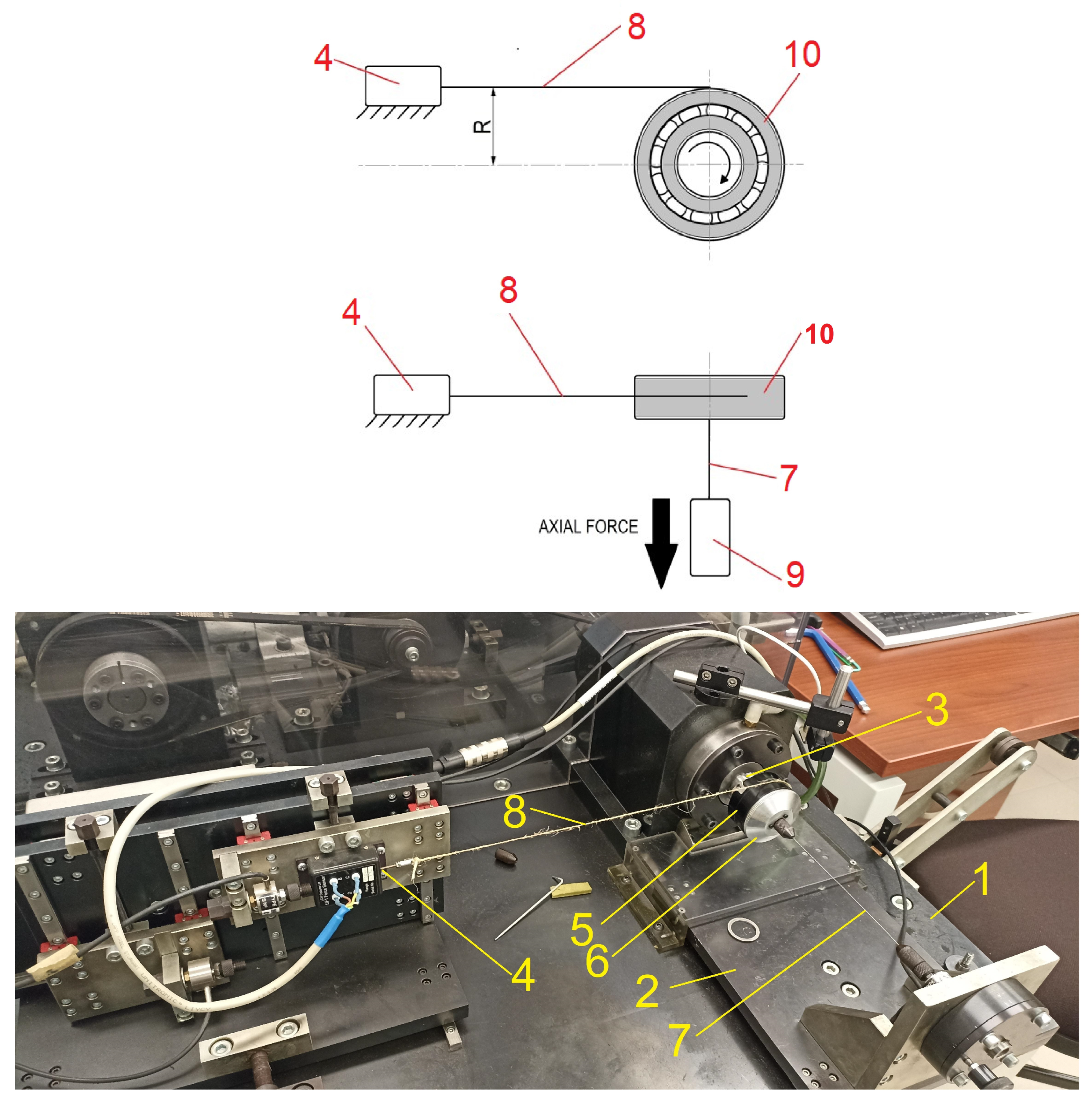 On the main base (1) of the measuring device, a longitudinal load table (2) is mounted, which cooperates with an actuator fixed to the underside of the base. The table is integrated with an axial force sensor. On the left side of the spindle (3), a table is placed to which force gauges (4) can be connected. The drive unit provides smooth, adjustable spindle rotation speeds up to 26,000 rpm. The outer ring of the tested bearing is placed in a thin-walled housing made of aluminum alloy (5), with a flange that prevents the bearing from falling out on the opposite side. The tested bearing (10) is mounted on a shaft with a sliding fit and is fixed by the face of the inner ring using a screw threaded into the shaft via a washer. A cover (6) is screwed onto the housing. At the center of the cover, a rod is attached to apply axial load (7). A rod mounting system is located on the surface forming the bearing housing. One force gauge (9) is mounted on the measuring table and connected to the measuring housing via a rod (8). Frictional moment occurring in the bearing causes the outer ring and housing to attempt to rotate, which transfers force through the rod proportional to the resisting moment. The software then records the resulting changes and, based on the input data of the tested bearing, calculates the resisting moment. The presented test rig performs frictional moment measurements at a frequency of every 0.02 s. The rig allows for adjustment of the bearing’s rotational speed as well as the values of applied axial and radial loads.