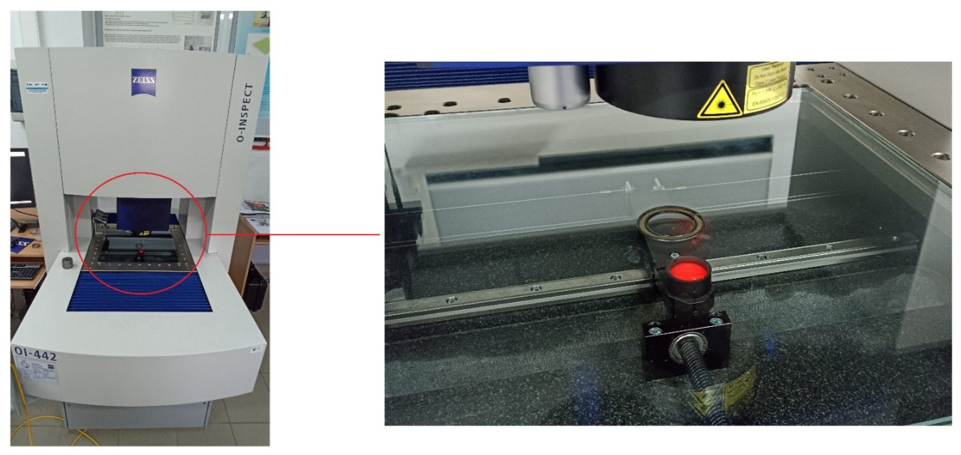 To perform the measurement of roundness and waviness deviations, a multisensor coordinate measuring machine, O-Inspect by Zeiss (Oberkochen, Germany), was used. The measurement was carried out using an optical method with an optical system magnification of 0.5X and using transmitted light. The measured profile was then filtered using a Gaussian filter in two ranges: 2–15 undulations per revolution (for roundness) and 15–500 undulations per revolution (for waviness). Based on the reference circle determined using the least squares method (LS mean circle), the roundness deviation RONt