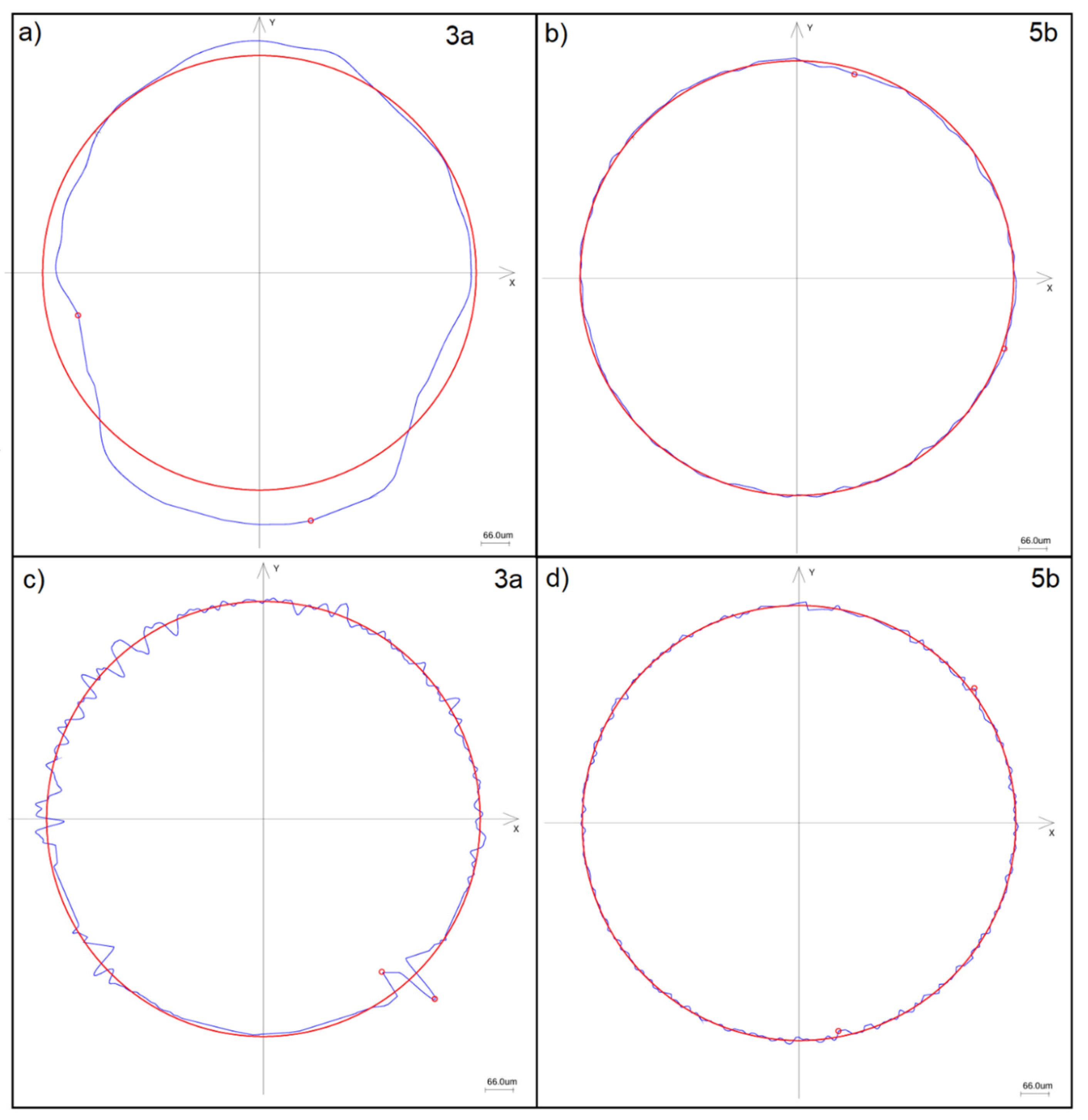 Figure 4 presents the roundness and waviness profiles for two selected sealing rings with extreme roundness deviation values (see 3a and 5b in