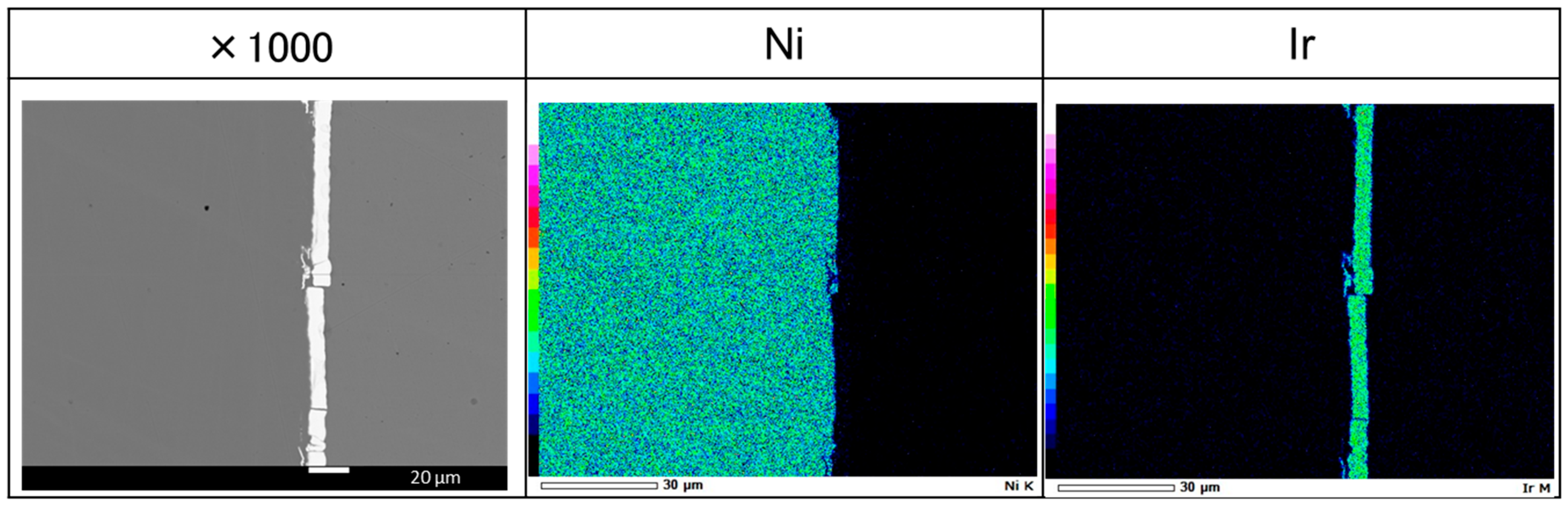 2) for a time of 60 min, which ensures good adhesion and avoids side reactions like hydrogen evolution. Ir forms a continuous metallic layer across the Ni surface. The obtained layer has around 7 micrometers of thickness and creates a smooth interface with conductive resin, which was used for cross-section preparation. This bilayer structure was used as a working electrode for the molten-salt modification process. Electrodes were immersed in a molten-salt mixture consisting of Al, which was potentiostatically deposited on the electrode surface at a potential of −1.4 V. According to our previous works related to different stainless steels, Ni, and Ni-Pt electrodes modified by Al deposition, a high temperature of the melt during the reduction of Al on the surface allows for the immediate formation of intermetallic phases. After a certain deposition time (1 h), reverse polarization takes place at a potential of −0.5 V, and deposited Al and Al-based compounds are electrochemically dissolved, which forms a porous, uniform structure.