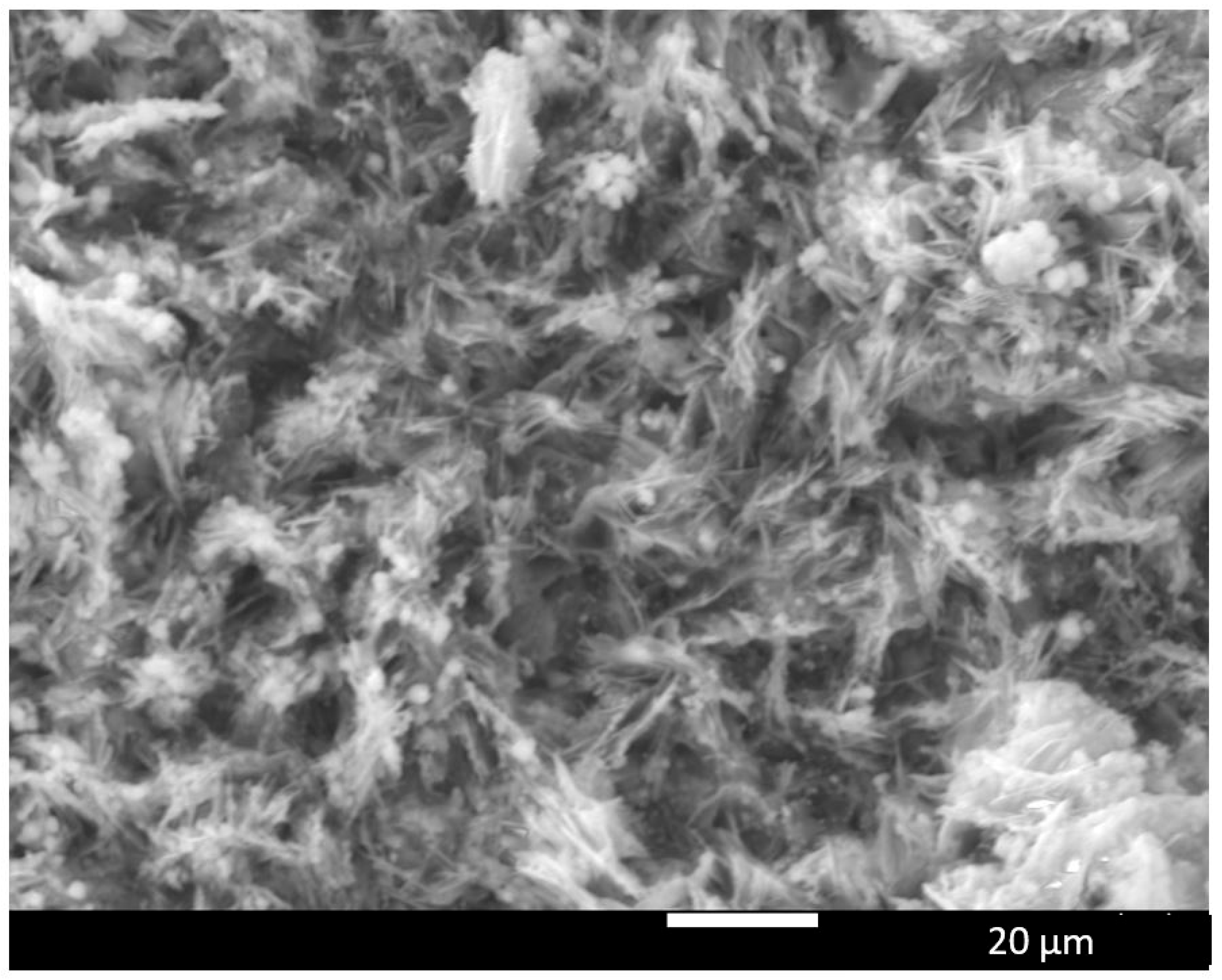 For Ni–Ir electrode fabrication, a thin layer of iridium was first electrodeposited onto the Ni substrate from an aqueous Ir plating bath. The galvanostatic deposition was carried out at a constant current density of 5 mA·cm−2 for 60 min, using a platinum counter electrode and an Ag/AgCl reference electrode. This procedure produced a continuous Ir coating over the Ni plate. The success of the Ir plating was evidenced by a uniform grayish metallic sheen on the Ni surface. A uniform noble-metal pre-layer is important, as it ensures that, in the next step (molten-salt alloying), the added Al will interact evenly with Ir across the entire surface rather than only in isolated spots. After preparing the Ir-coated Ni, the samples were subjected to a molten-salt treatment to deposit aluminum and then remove it to form a porous structure. The molten-salt melt was a eutectic mixture of NaCl–KCl containing 3.5 mol% AlF3, which was maintained at 750 °C under an inert argon atmosphere. Each Ir-coated Ni sample was immersed in the molten salt, and aluminum was electrodeposited onto it at a constant potential of −1.4 V vs. Ag/AgCl. The deposition was continued for 3600 s (1 h), during which Al+3 from the melt was reduced to Al0, which infiltrated the Ni/Ir surface (note: at 750 °C, deposited aluminum is liquid and can diffuse into the Ni matrix, forming Ni–Al and possibly Ir–Al intermetallic compounds). Immediately after this cathodic Al deposition, the electrode was subjected in situ to an anodic dissolution step: the potential was reversed to about −0.5 V vs. Ag/AgCl (still at 750 °C in the melt) and held until the anodic current decayed to near zero. This anodic polarization causes the freshly deposited aluminum (and Al-rich phases) to oxidize and dissolve back into the molten salt, selectively leaching out Al from the alloyed layer. Essentially, the Ni–Al (and any Ir–Al) compounds that formed are partially dealloyed, leaving behind a porous, nickel-rich skeleton. Once the current had dropped, indicating that most removable Al had been dissolved away, the sample was carefully withdrawn from the melt and allowed to air-cool to room temperature. Finally, any residual salt adhering to the sample was removed by rinsing in hot deionized water, yielding the finished porous Ni–Ir electrode.