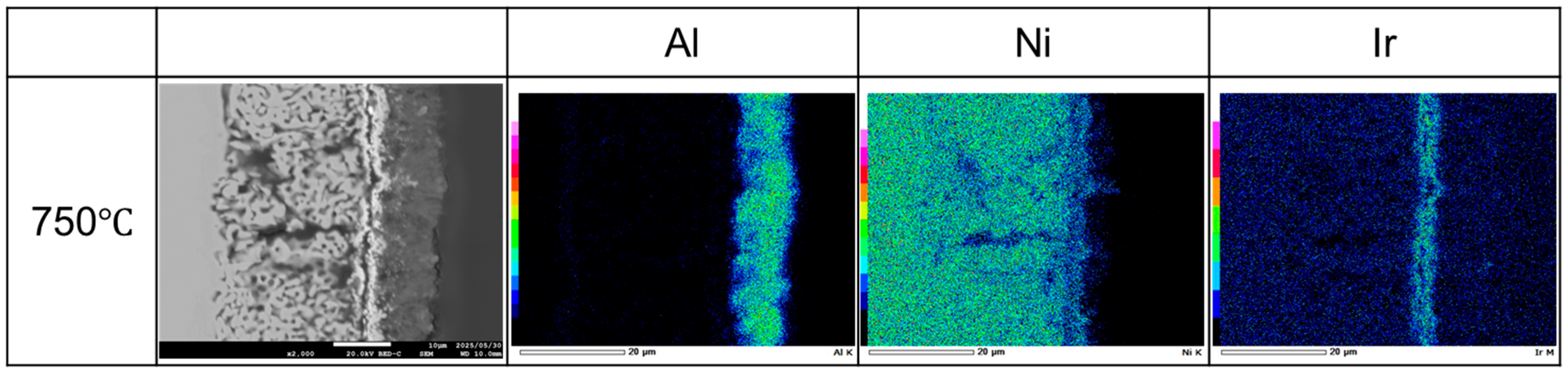 Liquid Al penetrating the Ni (and Ni–Ir) at a high temperature reacts to form Ni–Al intermetallics, and upon Al removal, leaves behind a sponge-like Ni-rich matrix. Notably, the presence of Ir does not disrupt the formation of this porous “Raney-type” structure. Instead, Ir may subtly influence the microstructure—for example, by slightly refining the pore size or distribution—due to its effects on diffusion kinetics (