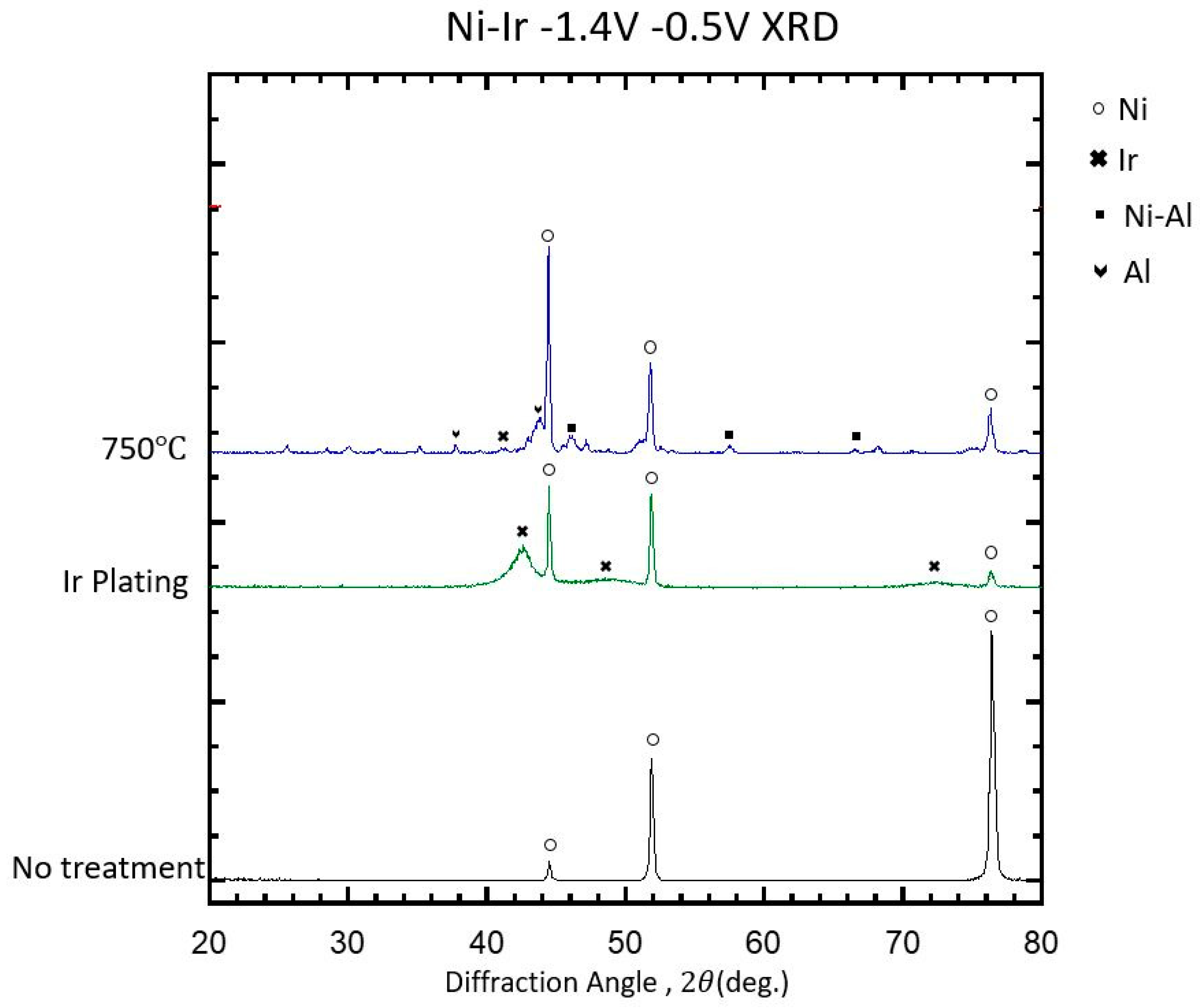 Before any treatment, the Ni sample shows diffraction peaks at 44.5°, 51.8°, and 76.4° 2θ, corresponding to the (111), (200), and (220) planes of face-centered cubic Ni. After Ir plating, some additional signals from the Ir metallic phase at 43.79 (111), 47.41 (200), and 73.72 (220) were detected. The intensity and location of Ir-based signals suggest that the deposited Ir has a nanostructural/amorphous structure with strong texture preference, due to the fact that, in the literature, the signals for (111) and (220) are on slightly different positions—40.83 and 76.20. After the molten-salt Al treatment and subsequent dealloying, the XRD pattern still exhibits the primary Ni (111), (200), and (220) peaks, but new minor peaks emerge at approximately 35.0°, 43.3°, and 57.5° 2θ. These additional reflections can be indexed to Ni3Al, with the (110), (111), and (210) planes, respectively. The presence of Ni