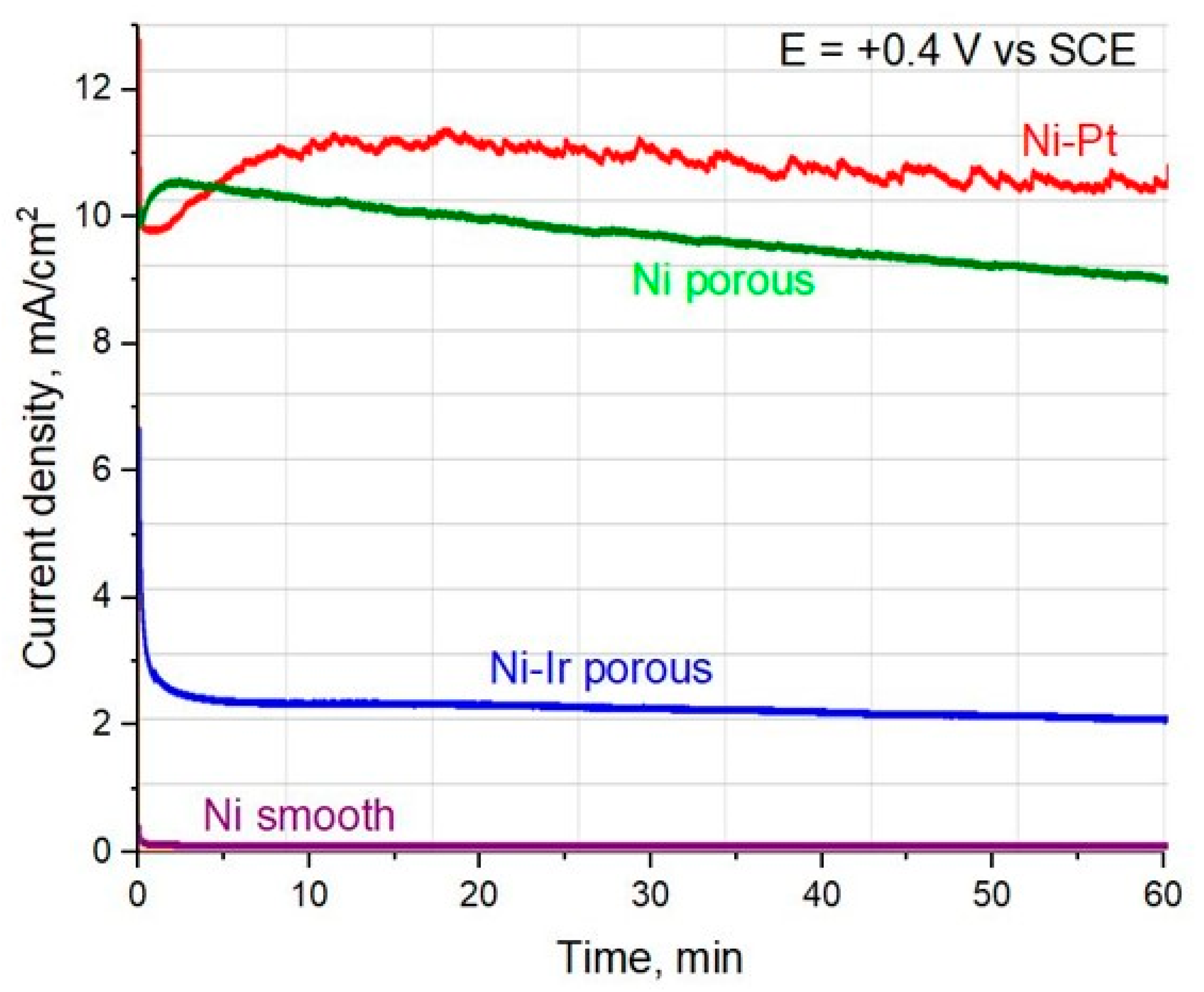 −2. The presence of Pt and Ir can modify the catalytic chemistry of the surface. Ni–Ir in an anodic scan can achieve higher urea oxidation currents at lower overpotentials, improving efficiency, which was reported in many studies related to OER. This is a reason why we also tested these electrodes in the urea electro-oxidation reaction, and to our best knowledge, there are no reports related to porous Ni-Ir materials tested in UOR. The long-term performance and durability of the porous Ni–Ir electrodes were assessed via chronoamperometric measurements, as shown in