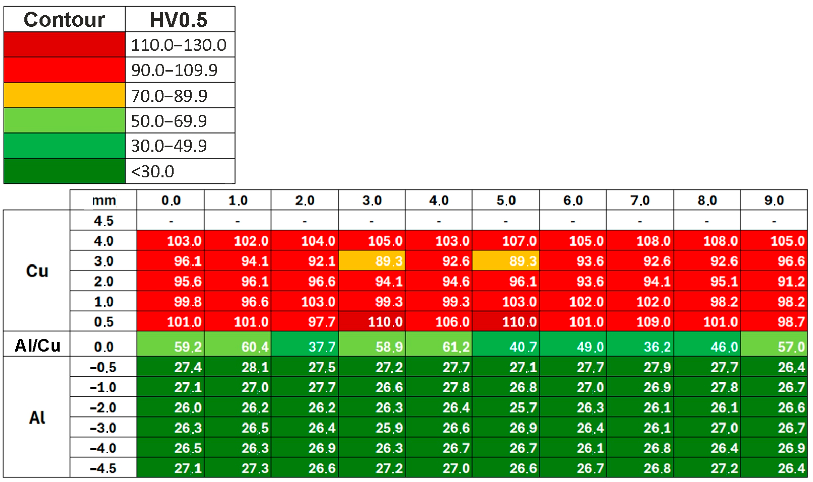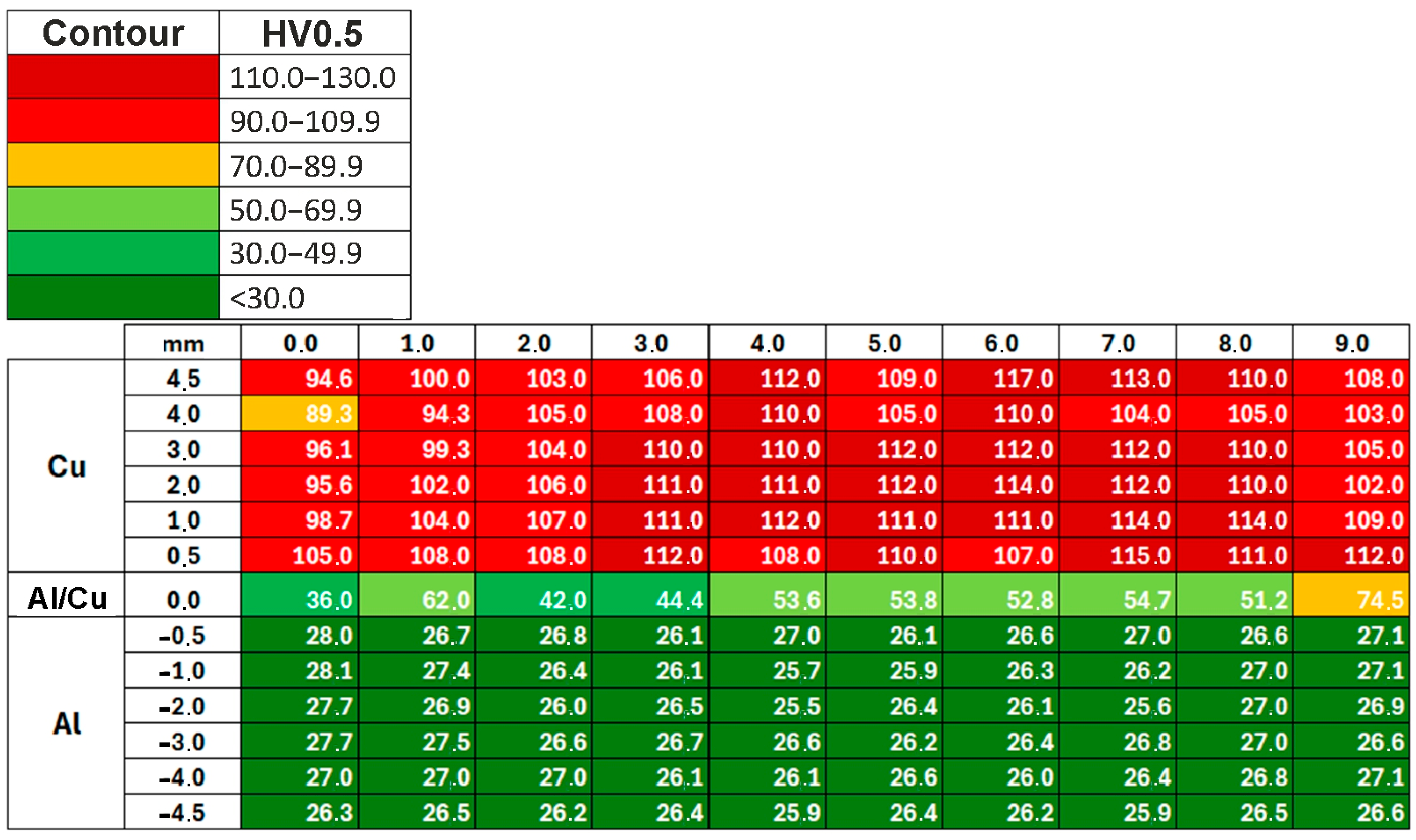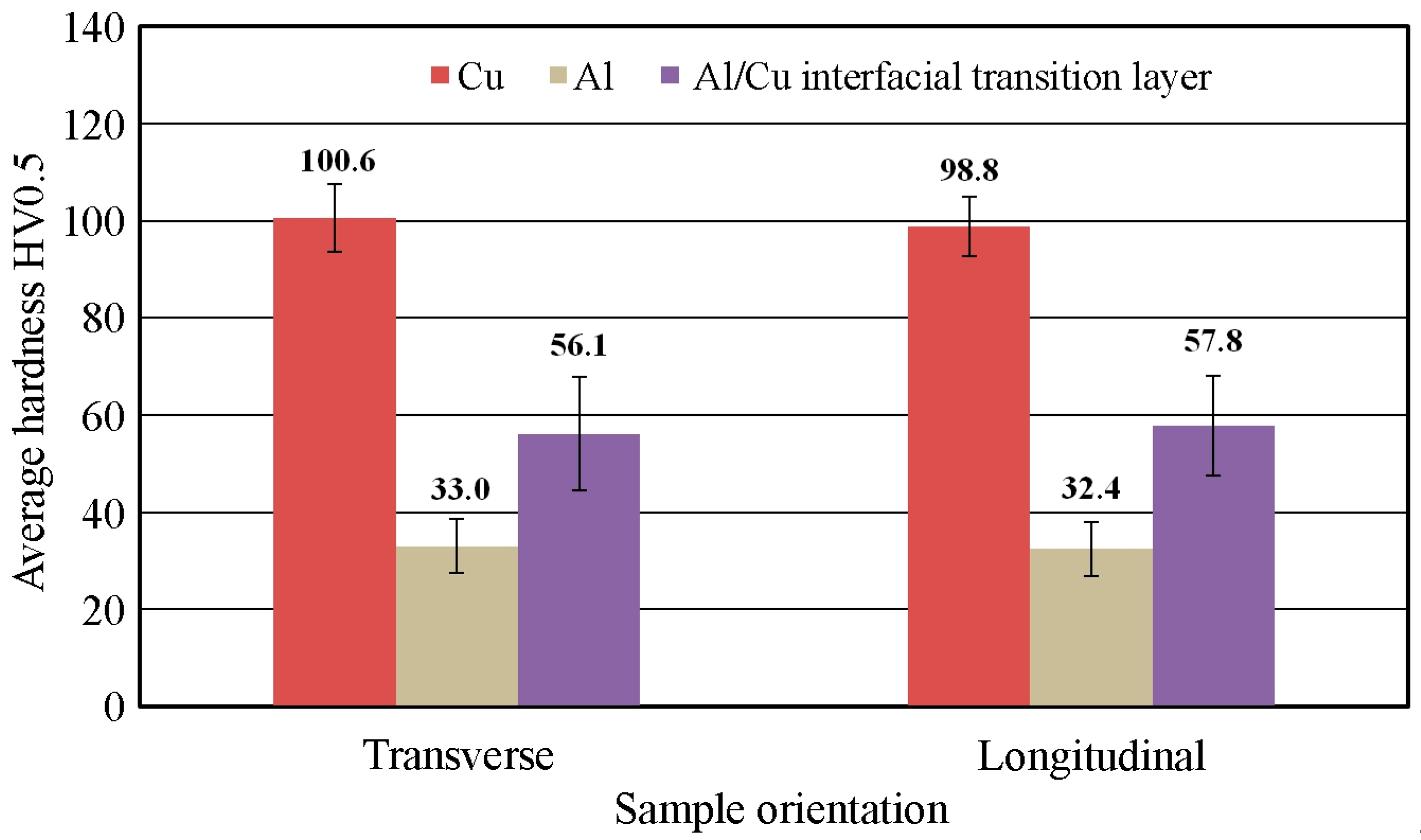 - The highest hardness values were obtained in the vicinity of the Al/Cu interfacial transition layer of the base materials. Areas closer to the outer surfaces of the samples had the lowest hardness values.