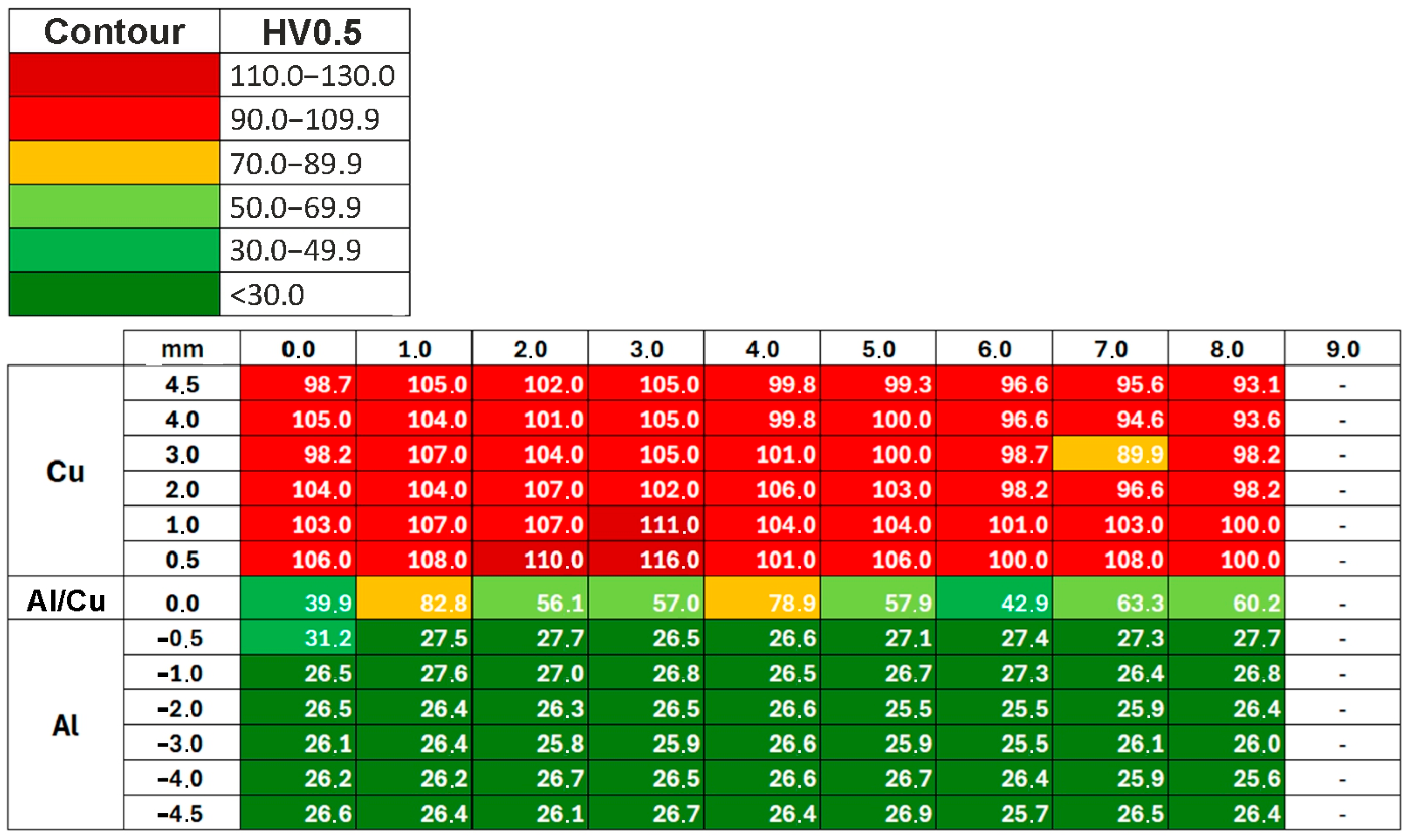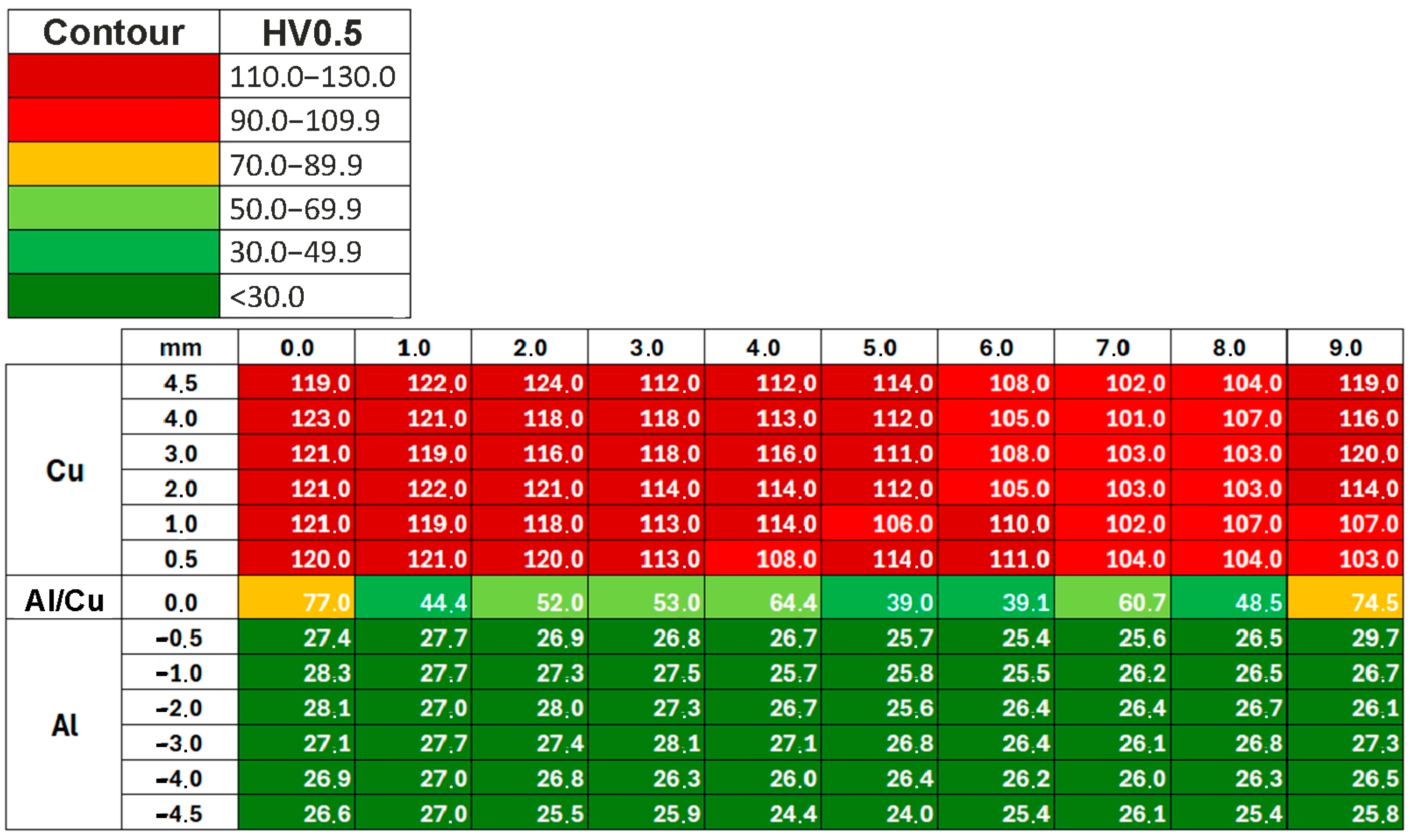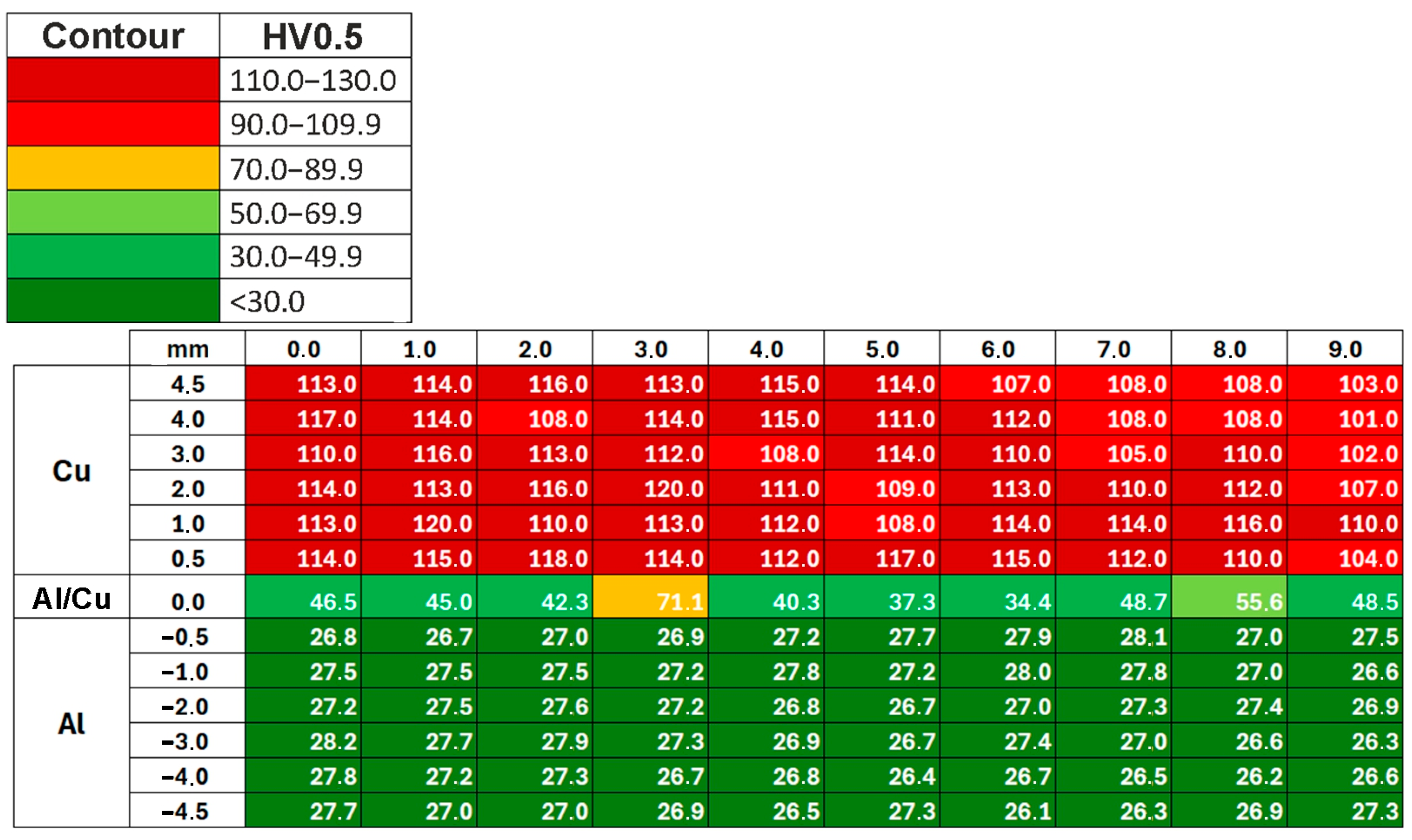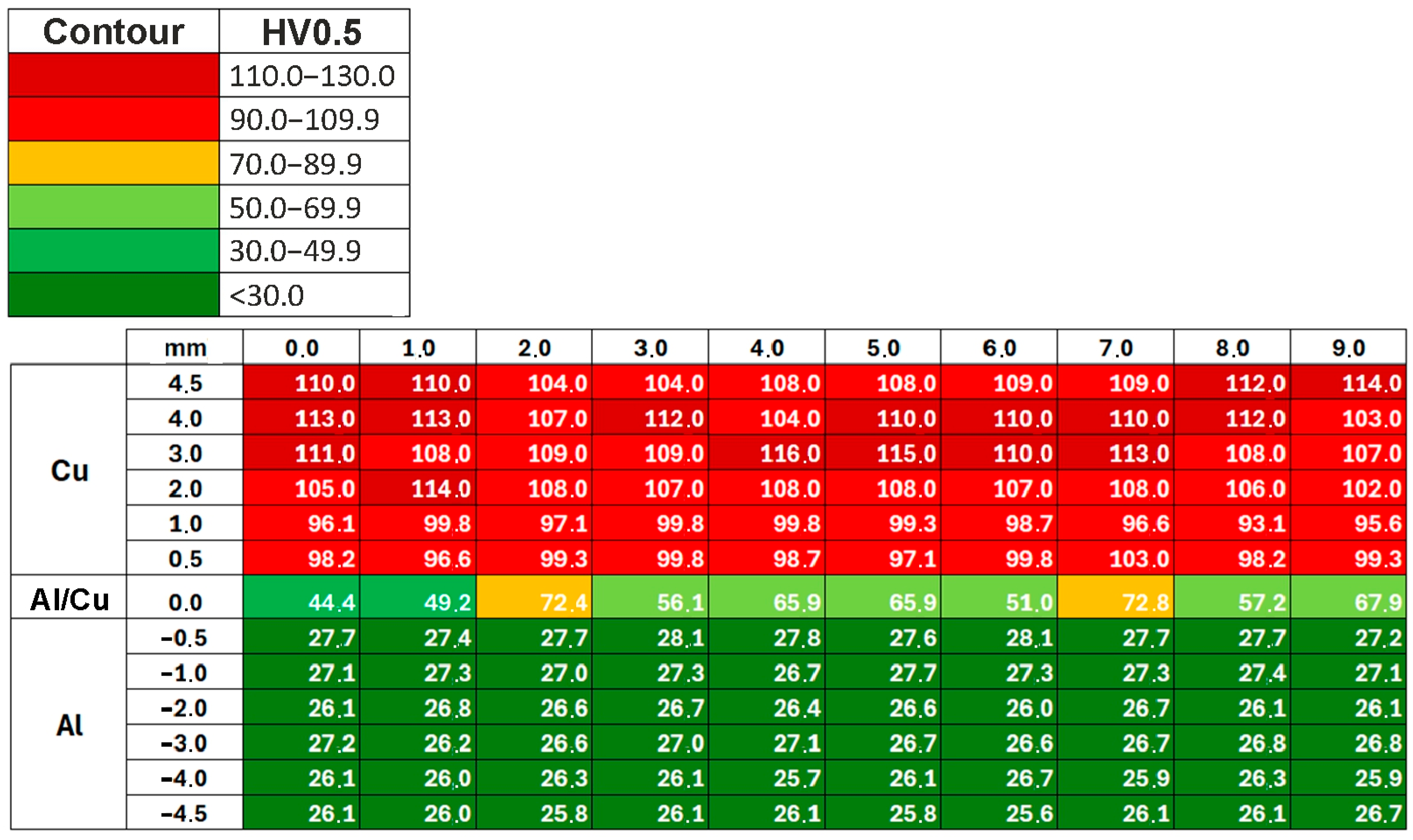 - The highest hardness values were obtained in the vicinity of the Al/Cu interfacial transition layer of the base materials. Areas closer to the outer surfaces of the samples had the lowest hardness values.
