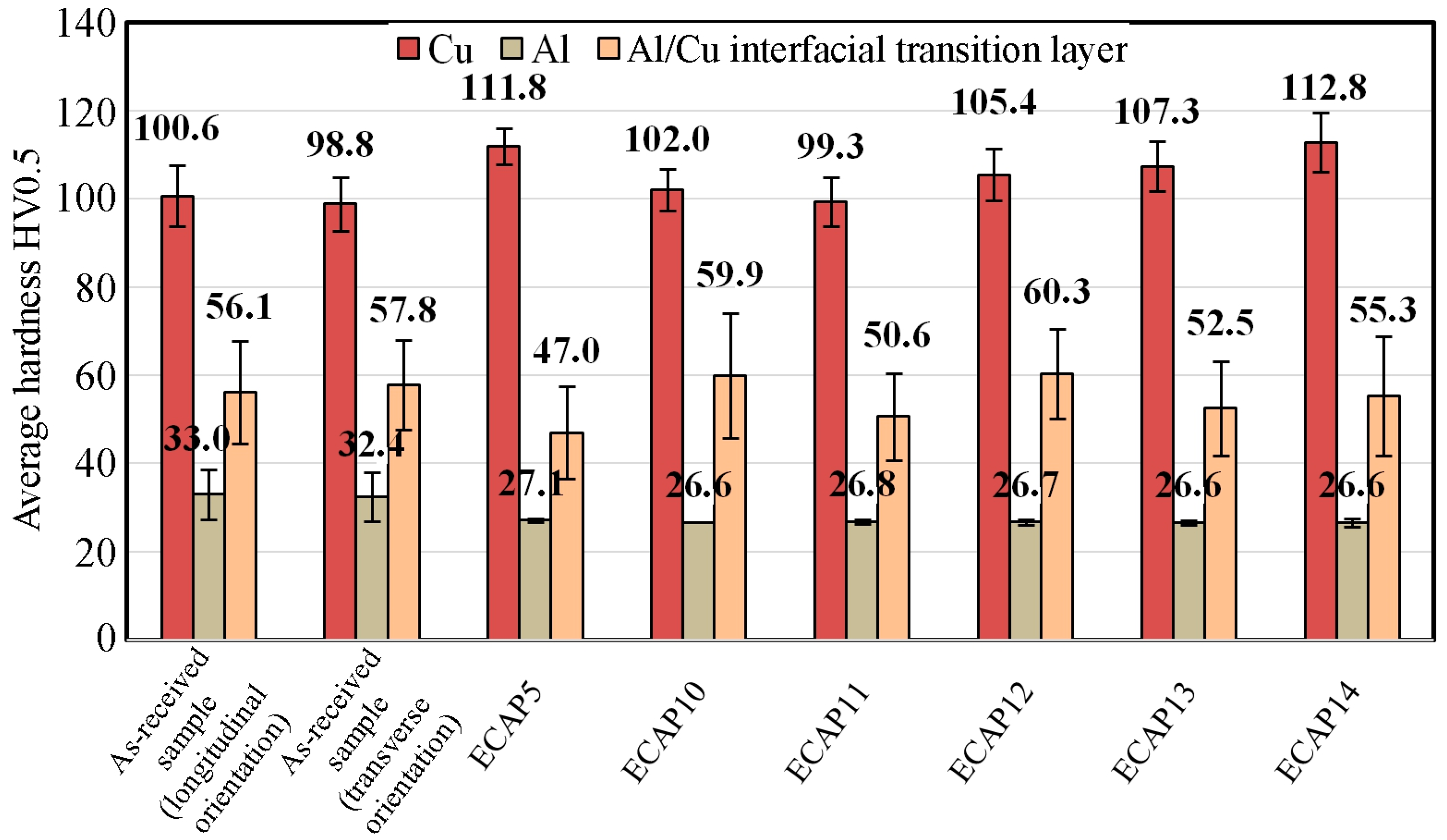 - After ECAP processing, the hardness in the Cu layer increased in all samples as a result of plastic deformation. Regardless of the sample orientation in the die entry and the number of passes, the hardness values in the Al plate of all ECAP-processed samples were very similar and lower than those measured in the base material.