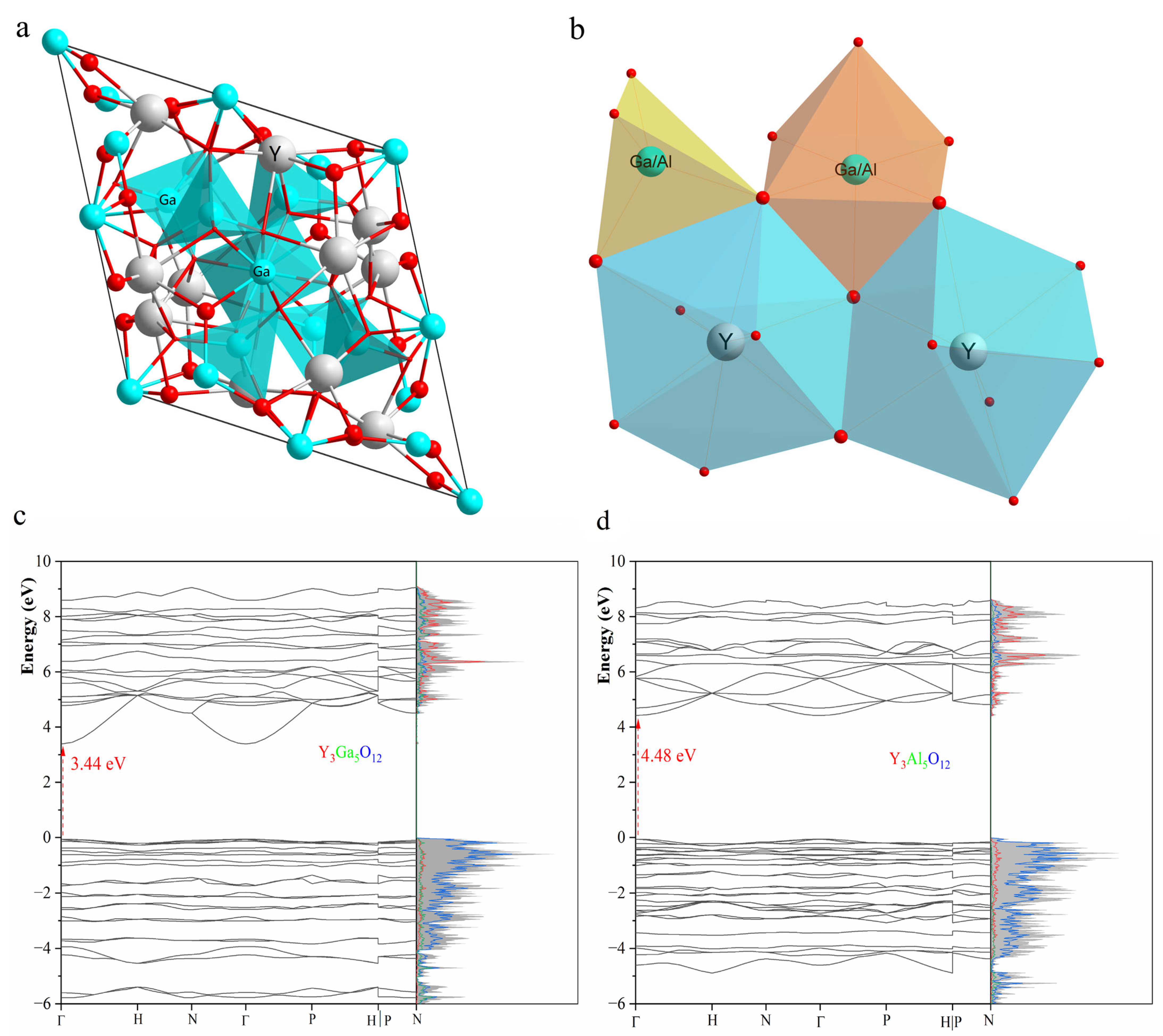 Figure 1. Crystalline structures of Y3Ga5(Al5)O12 (a) consisting of [YO8] polyhedron and edge-sharing clusters (b). Band structure and density of states of (c) YGG and (d) YGG calculated by the PBEsol function.