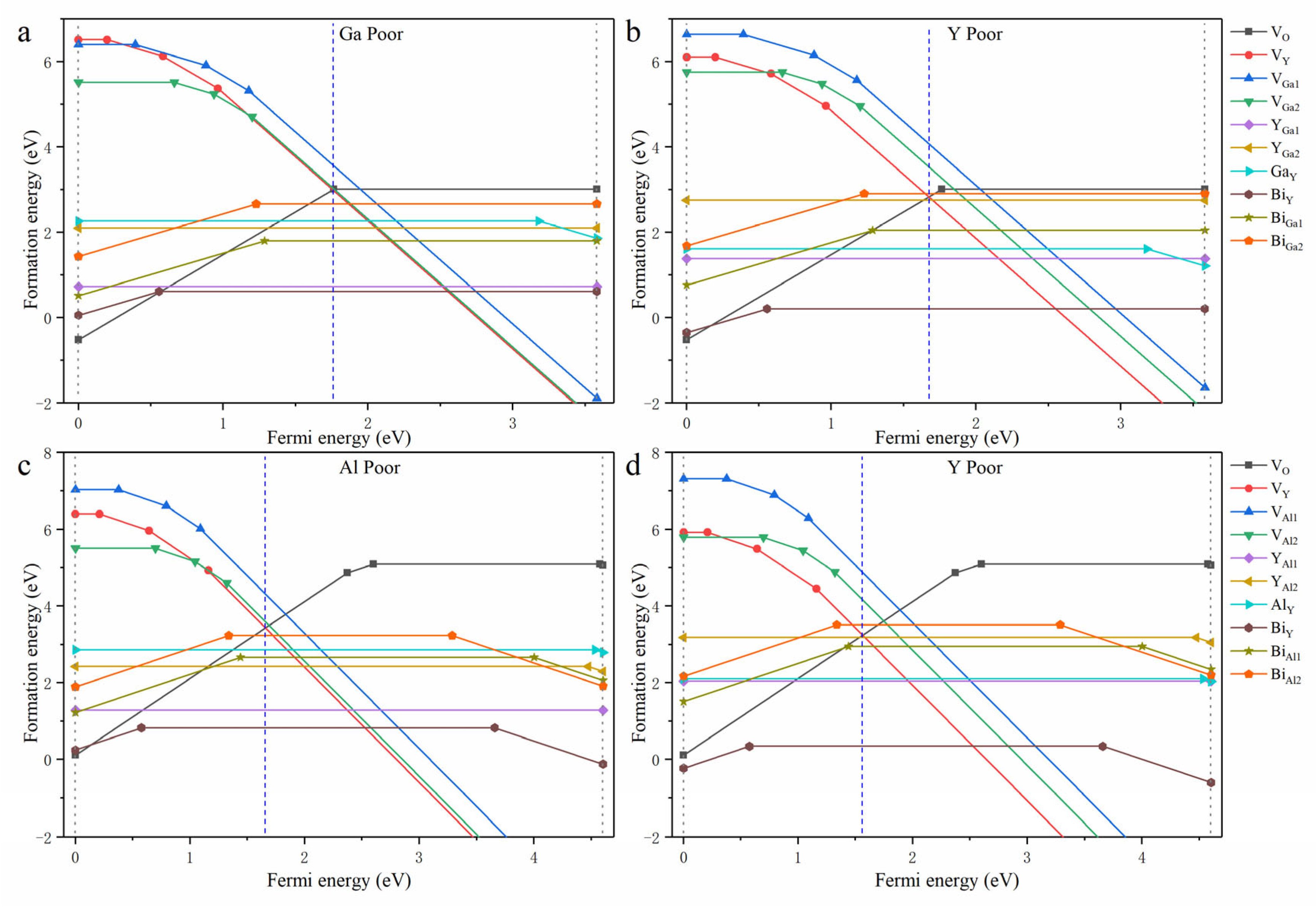 As indicated by Equation (2), the formation energy of a defect is related to the atomic chemical potential, which can be determined by the thermodynamic constraints that correspond to the actual synthesis process. It is found that the Gibbs free energy, which is equal to the chemical potential, can be estimated by the total energy calculated in DFT. The chemical potential of a compound can be represented as the sum of the chemical potential of each constituent element. Accordingly, the chemical potentials of Y, Ga, Al, and O are subject to the following relation: