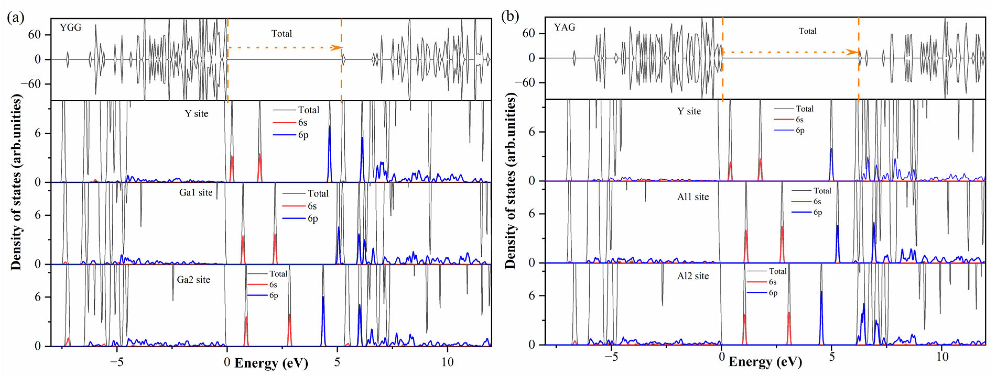 As shown in Figure 1a, the converted YGG and YAG cells each contain 12 Y atoms and 20 Ga and or Al atoms. The Bi-doping concentrations are 8% for Y sites and 5% for Ga (Al) sites, consistent with the experimental values. The lattice parameters of unrelaxed converted cells taken from the cubic crystal are 10.396 Å for YAG and 10.692 Å for YGG. After structural optimization, the inherent deficiencies of the PBEsol functional induce a lattice parameter shrinkage of 0.1% for YAG and 0.6% for YGG, as listed in Table 2.