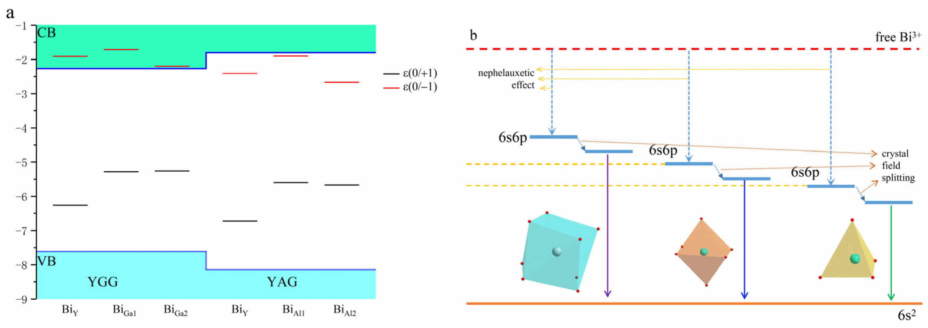 Figure 5a shows the VRBE model of YGG and YAG, with the band aligned to the vacuum level. The VBM of YGG is located at −7.69 eV, while the VBM of YAG is at −8.14 eV. In addition to the VBM and CBM, the transition levels of Bi3+ are also aligned with the vacuum level. All ε(0/−1) of Bi3+-doped YGG are inside the conduction band, indicating the instability of Bi2+ in YGG. However, the stable Bi2+ can be formed in YAG due to its larger band gap. Yet, the corresponding excitation and emission will also be large. When the Bi3+ ion changes from Y sites to Ga sites or Al sites, the ε(0/+1) shifts upward, while the ε(0/−1) shifts downward, with a notable exception: BiGa1 (BiAl1) shows the highest transition level. As mentioned above, the Ga1 (Al1) sites present the highest point symmetry. This implies that variations in bond length and coordination number significantly influence the 6s and 6p orbitals. It is worth noting that the shifts in ε(0/+1) and ε(0/−1) follow a similar trend to the energy movements of the 6s and 6p orbitals, as shown in Figure 3. In summary, the nephelauxetic effect and crystal field splitting are illustrated in Figure 5b. As Bi3+ changes from the Y sites to the octahedron and tetrahedron sites, the reduction in bond length, coordination number, and the corresponding enhancement of nephelauxetic effect decrease the energy difference between the 6s6p state and the 6s2 state, resulting in a red shift from the violet to the visible range.