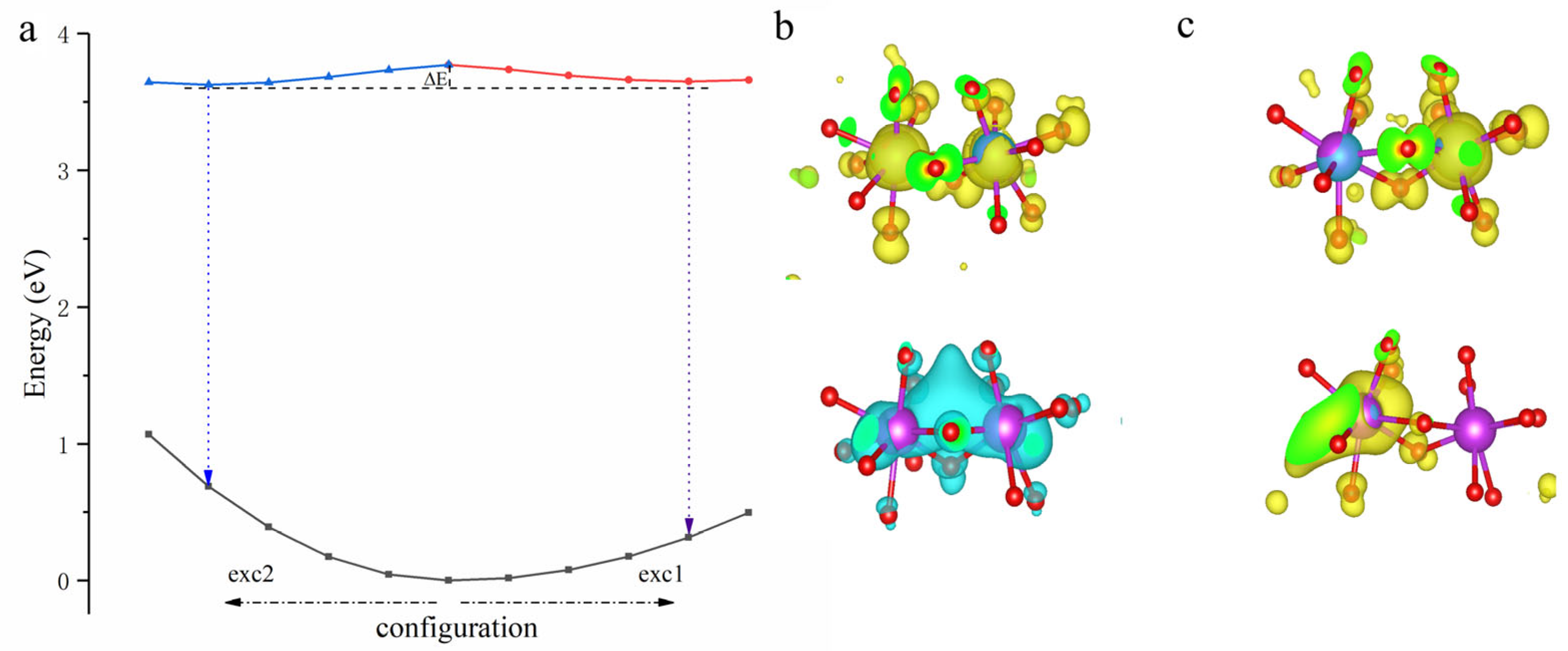 Figure 6. (a) The configuration coordinate diagram of the Bi3+ dimer in YGG. The exc1 and exc2 represent the relaxed path of the excited state of the Bi3+ dimer, and the ∆E is the energy barrier between the two excited states. (b,c) The charge densities of the excited state of exc1 and exc2, with the upper presenting the density of the hole and the lower presenting the density of the electron.