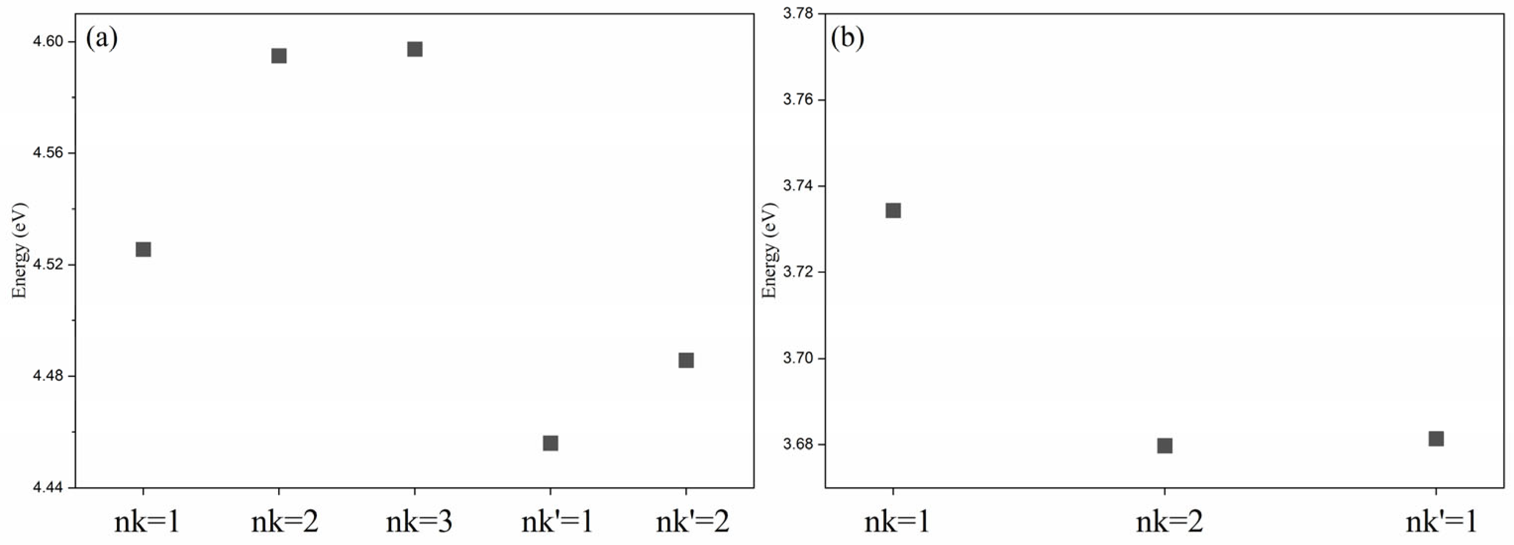 Figure A1 shows the convergence test of k-grids and cell size. The YAG is chosen as the test platform. Figure A1a shows the results of ε(0/+1) of Bi3+ at Y sites. The energy difference between 1 × 1 × 1 grids and 4 × 4 × 4 grids is about 0.08 eV. At the same time, the energy difference between the 80-atom system and the 160-atom system is about −0.08 eV. Figure A1b shows the test results of the 3P1-1S0 transition of Bi3+ at Y sites. The energy difference between the 1 × 1 × 1 grids and 2 × 2 × 2 grids is less than 0.06 eV. And the energy difference between the 80-atom system and the 160-atom system is less than 0.06 eV as well.