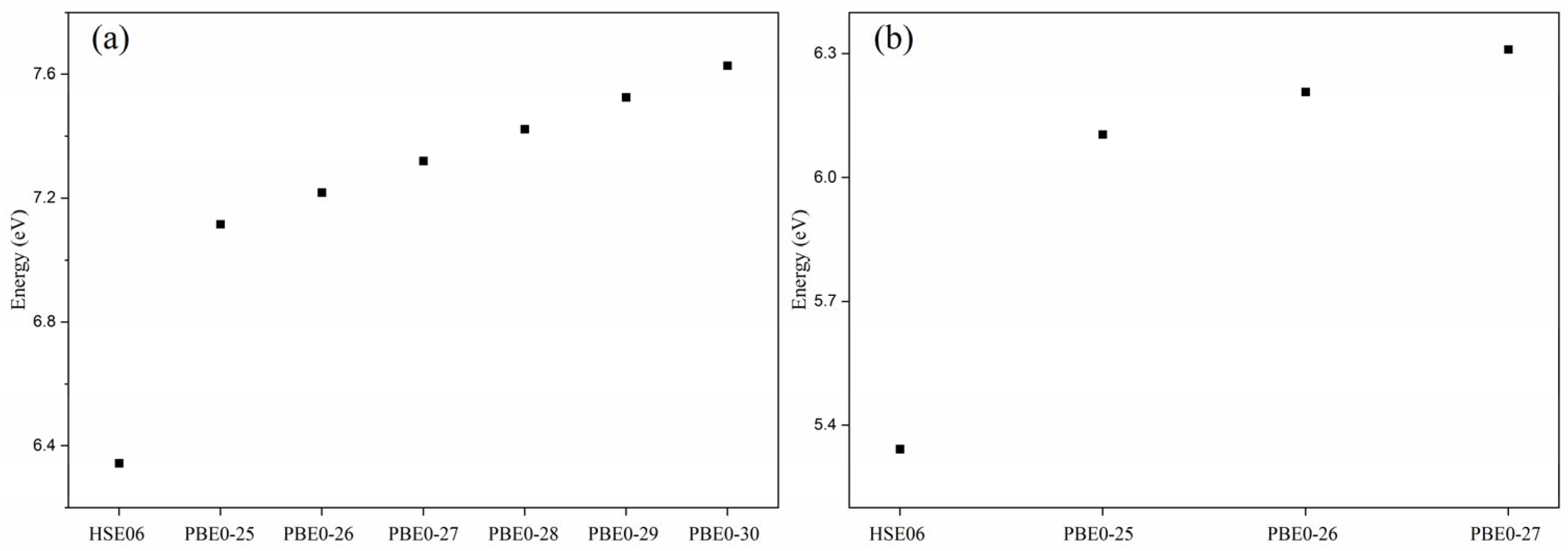 Figure A2. The influence of Hartree–Fock exchange fraction α in PBE0 on the band gap of (a) YAG and (b) YGG. Here, PBE0-α refers to the PBE0 functional with a Hartree–Fock exchange fraction of α.