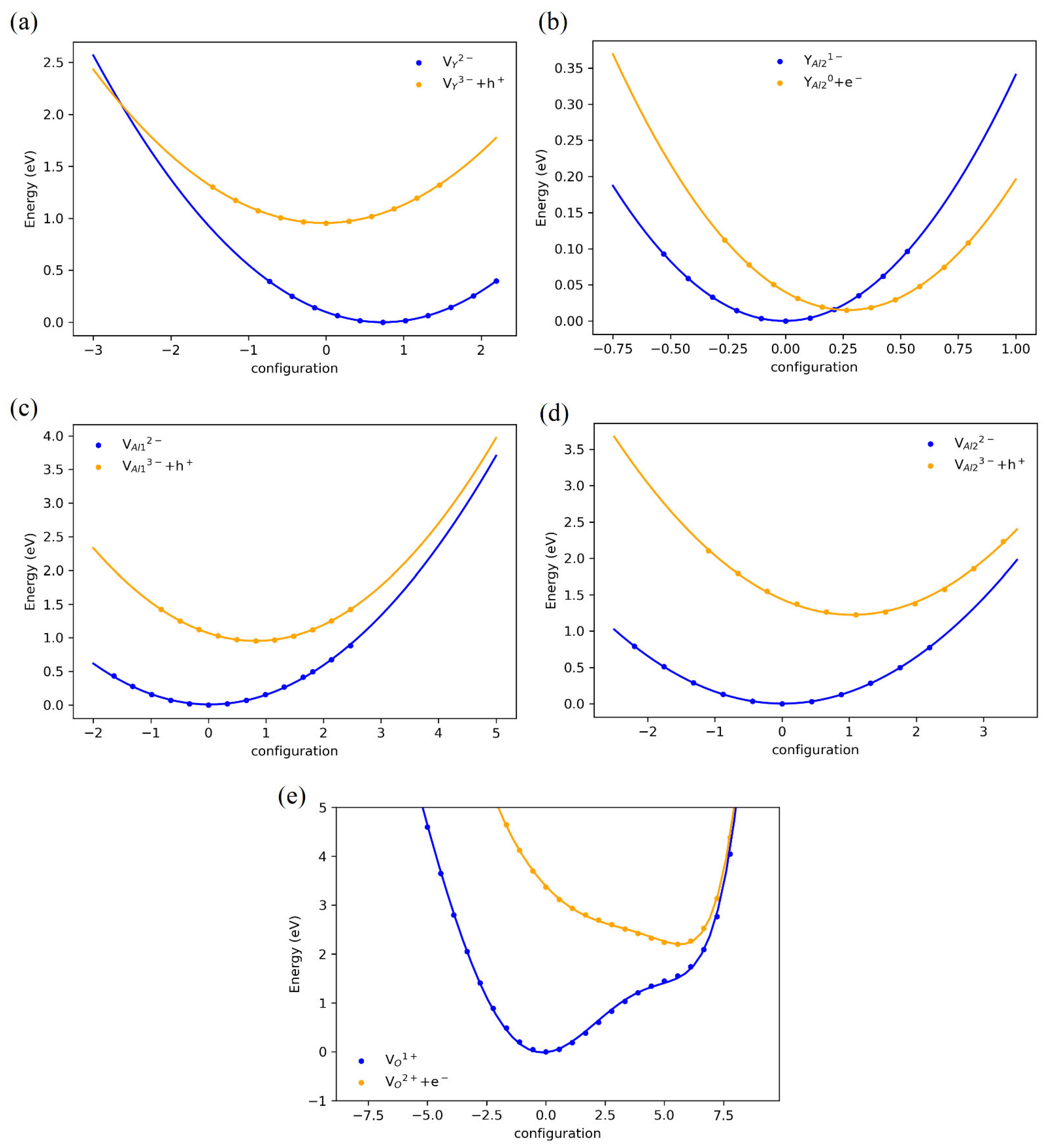 Figure A4 presents the configuration coordinates of the main defects in the YAG host. Here, we consider the classical carrier trapping process, in which traps capture carriers from the band edges. The structures are generated by linear interpolation, and the results are calculated with the PBEsol function. All defects show a harmonic relation between the energy and configuration, except oxygen vacancy, which exhibits strong anharmonic relationships. VY3− defects present a classical energy barrier for trapping a hole, with a barrier of about 1.0 eV. At the same time, YAl0 defects exhibit the lowest energy barrier with a value less than 0.05 eV, acting as a shallow electron trap. VAl13− and VAl23− defects show a larger energy barrier for hole trapping, with values greater than 1.0 eV. Oxygen vacancies exhibit a larger classical energy barrier as an electron trap, with a value greater than 2.0 eV. For these three types of defects, the tunneling effects should be important, as discussed in Alkauskas’s work [49].