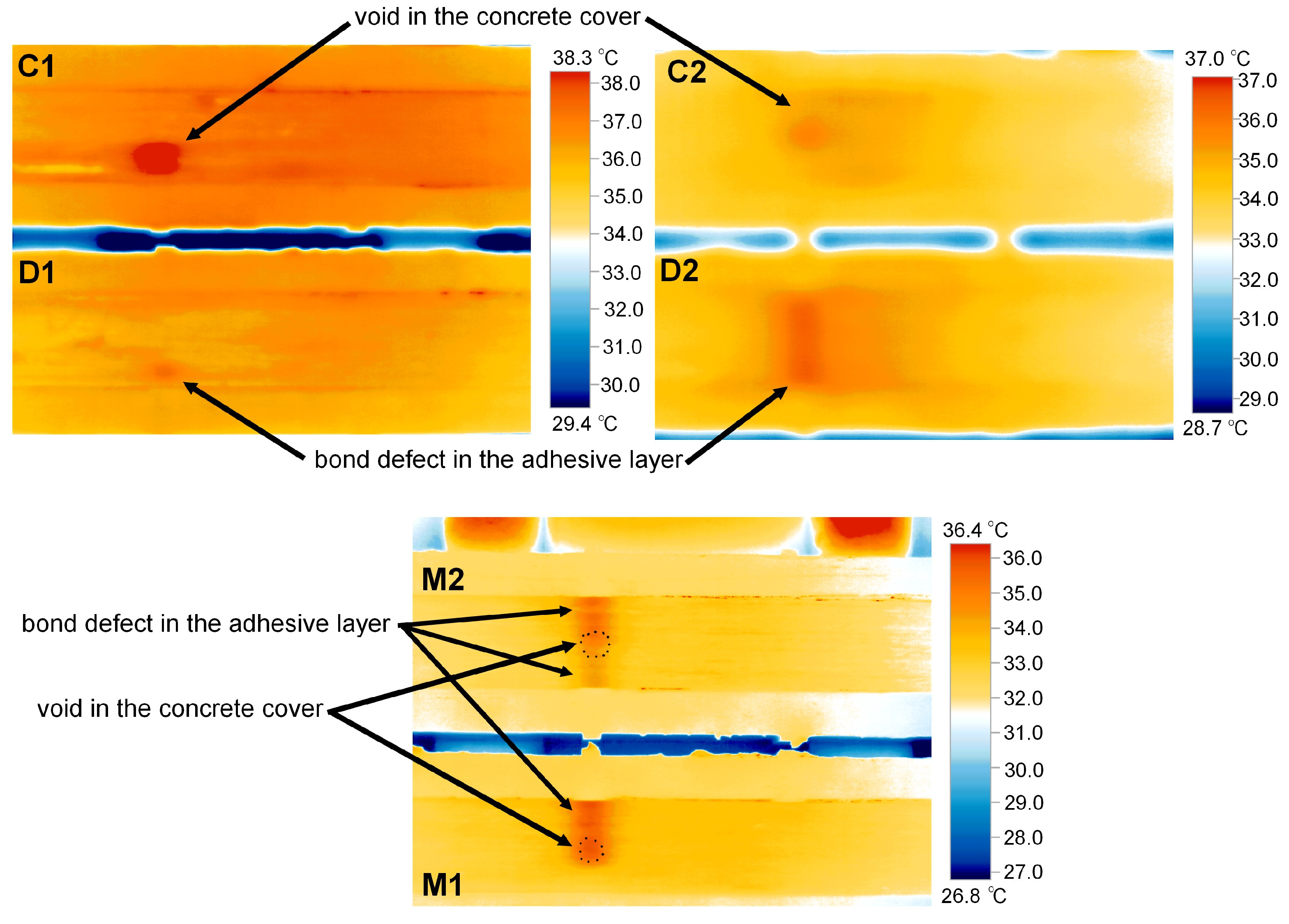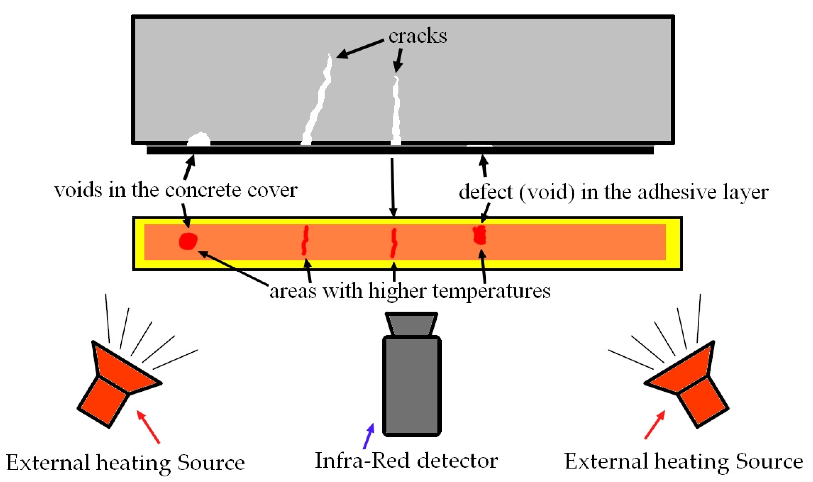 - Debonding caused by shear cracks or flexural cracks, i.e., defects in the reinforced concrete structure;