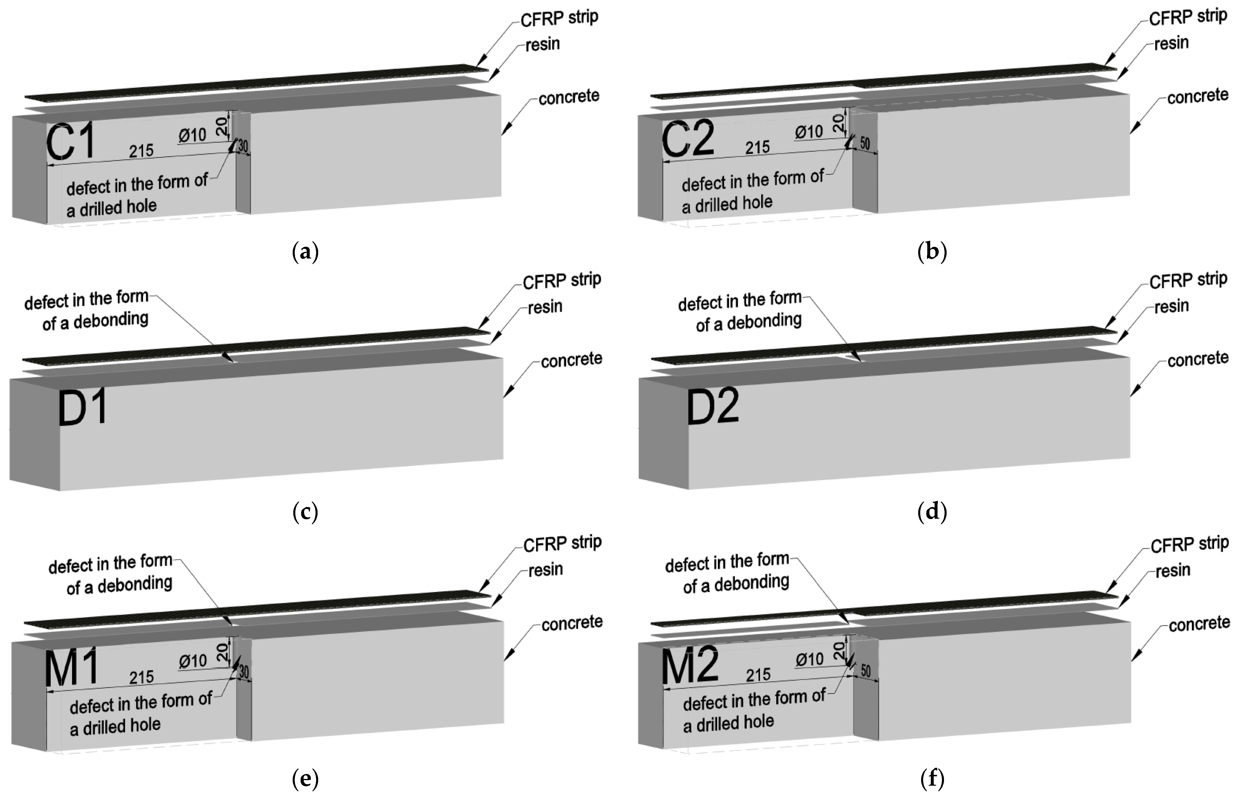 - D1 and D2—beams with a bond defect in the adhesive layer;